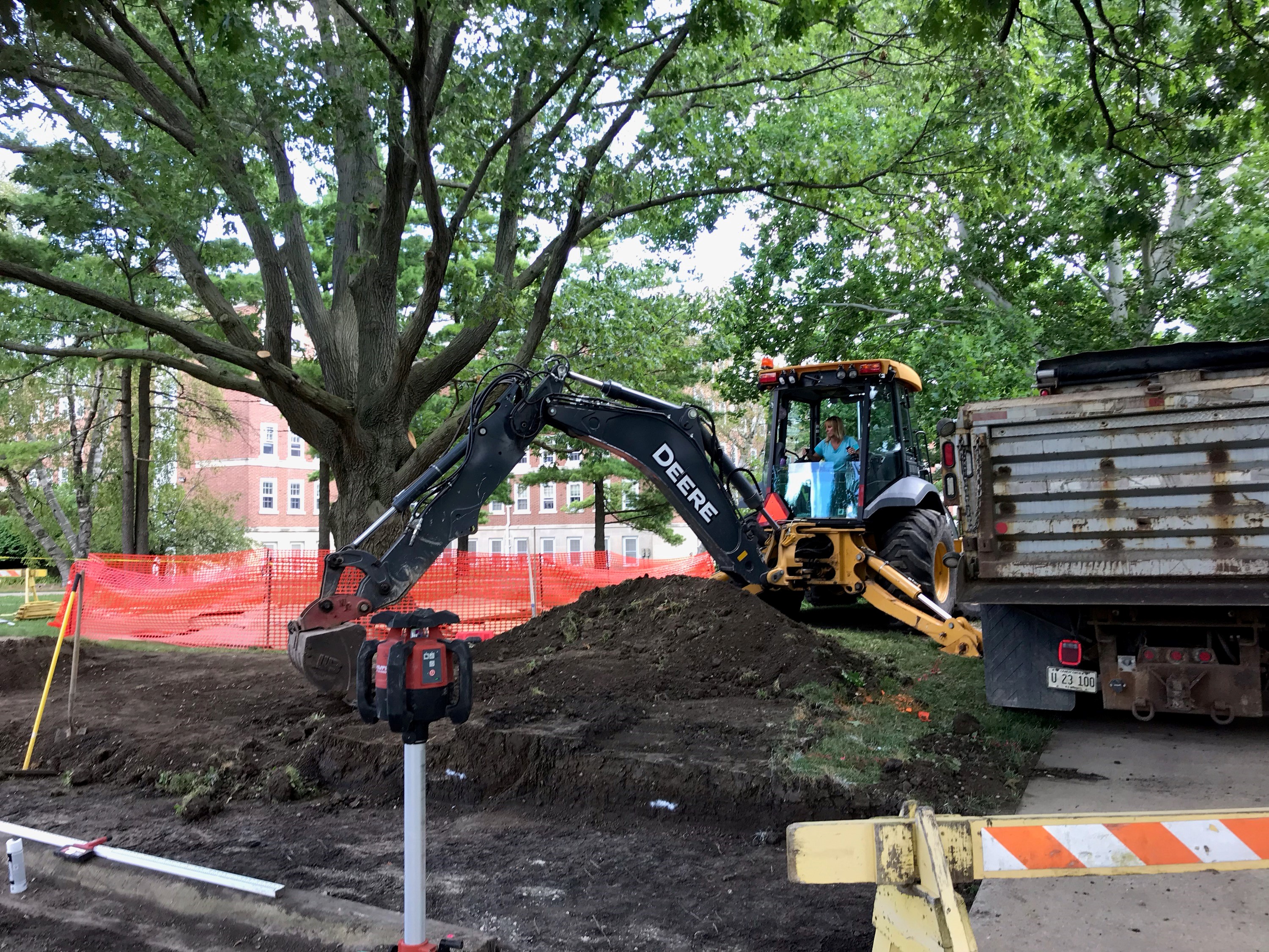Facilities and Services began Phase I, which is demolition and preparation. They excavated a portion of the ground, where a new sidewalk will be and removed a large portion of the berm. Tree protection has been up for a few days. The grass underneath the red oak is being removed in a chemical-free way with cardboard.