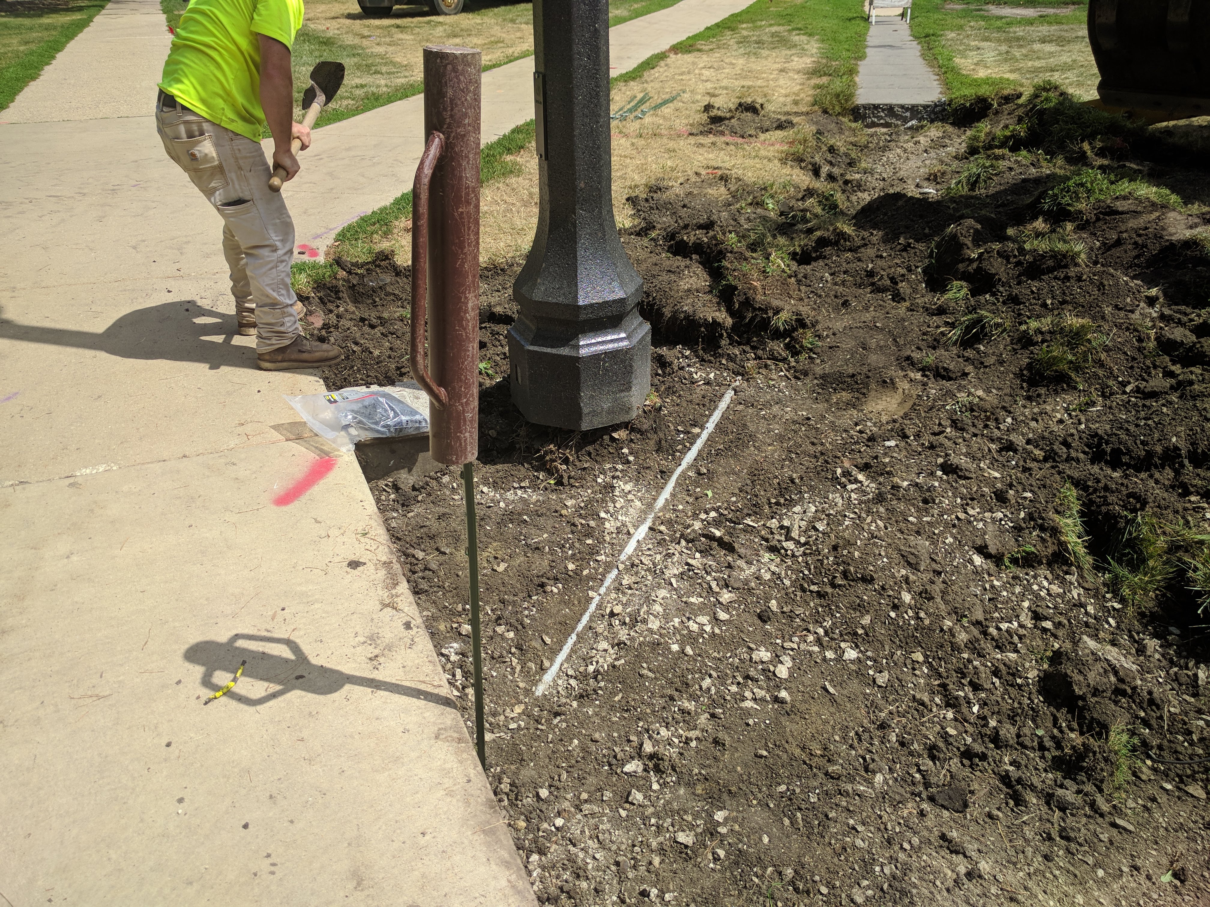 This took a while because the foundation for the lamp post extends 54″ underground and is packed in with road base stone. They did uncover a pretty sizable root which had grown between the two sidewalks while they were digging and were able to leave it in place. Once they had the light post out, they initially thought that they would be able to leave the adjoining sidewalk and pull a conduit underneath it to run the cables to the new post location. Unfortunately, the stone was packed too tightly underneath the sidewalk and the crew ended up needing to pull the sidewalk panel out entirely. They will replace it when they come back to expand the sidewalk. The Electricians finished up around 1:30 p.m. and closed off that section of sidewalk until it can be replaced.