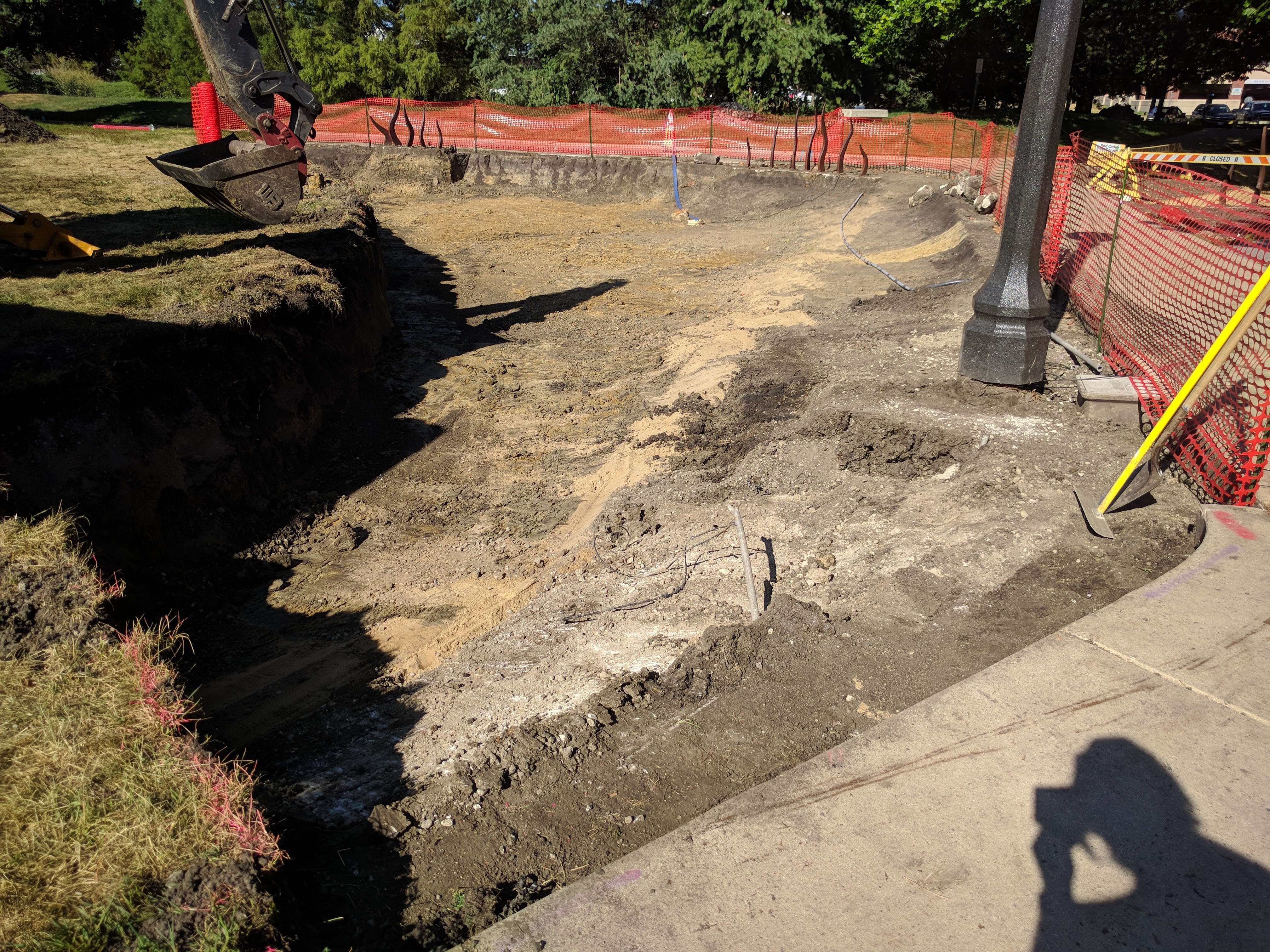 WED, AUG 14: Today was a bit slower of a day at the rain garden as we prepared to backfill the south cell with our bioretention soil mix tomorrow. When I arrived on site this morning, Facilities and Services’ Josh and Stephanie were working to finish excavating the east corner of the south cell beyond the lamp post where they had stopped yesterday. With the conduit running through this area and everything narrowing overall, we opted not to excavate to the full depth and instead excavated down to the top of conduit elevation, leaving a small shelf. In order to get to the far eastern corner of the garden we began removing the bike lane that extended to the McKinley Parking Lot and once excavation was complete we finished tearing out that section and backfilled it with topsoil.