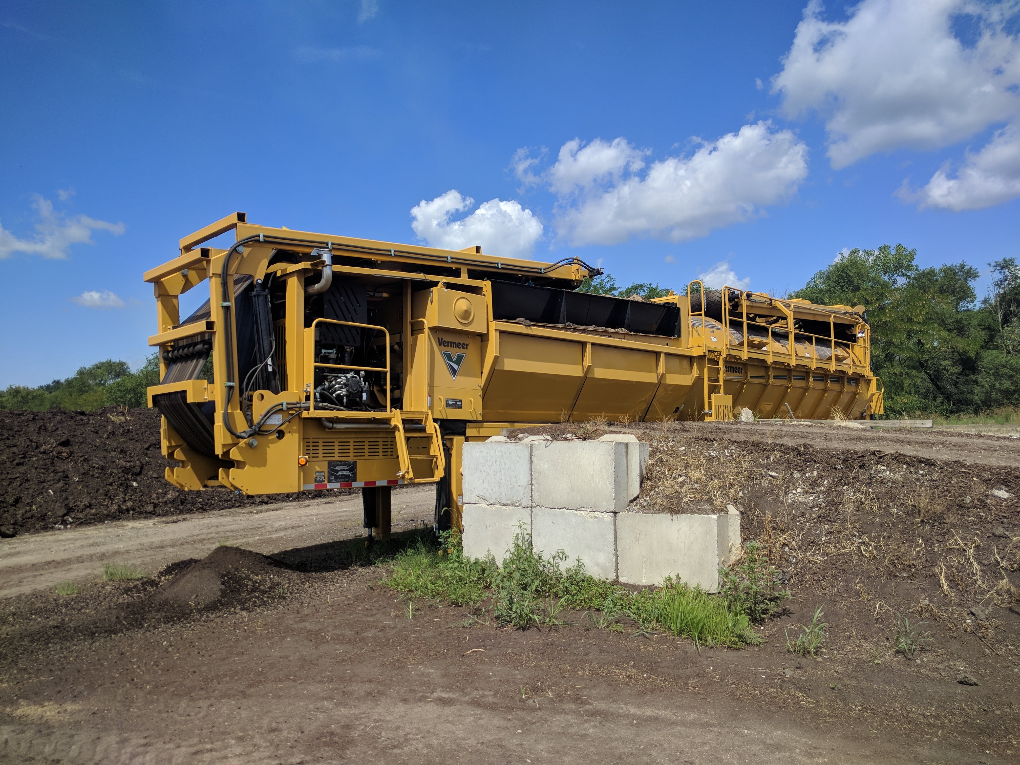 I went by the Landscape Recycling Center (LRC) to take a look at the bioretention soil mix they produced for us. The mix follows the Minnesota Stormwater Manual design specification, which calls for 60-70% sand, 15-25% topsoil, and 15-25% compost. LRC performed the soil mixing using a large sifter which they normally used for compost. First, they screened the sand to filter out rubble, clay, and other scrap which made up about 6 cubic yards of what had been delivered. Then, they mixed the soil and sand according to our specified ratio. And finally, they mixed that sand-soil blend with compost to arrive at our final mix. The soil looks good, it has the texture of a rich sandy loam with large clumps of compost scattered throughout. At first, the compost clumps look like clay but they break up easily and you can see the rich material inside.