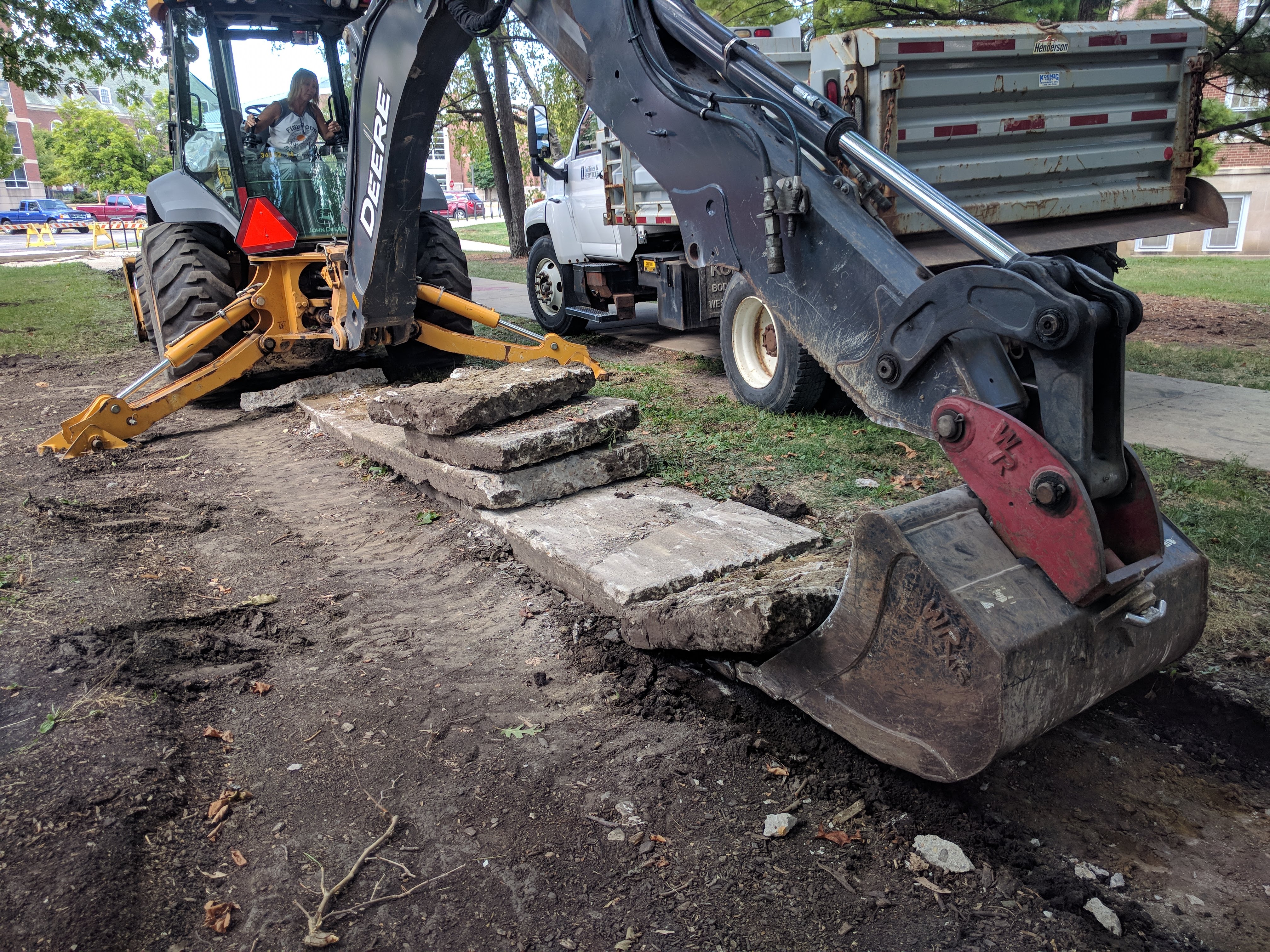 In the afternoon, Josh and Stephanie began removing the old bike path. They started at the bike racks near the Allen Hall parking lot and moved east towards the London Planetree. A bit of compaction occurred as a result of the backhoe pulling the concrete out, but nothing too severe. We’ll just have to make sure to break this compaction up before final stabilization. We finished up around 3:00 p.m. today with only a small section of bike path still to be removed east of the London Planetree.