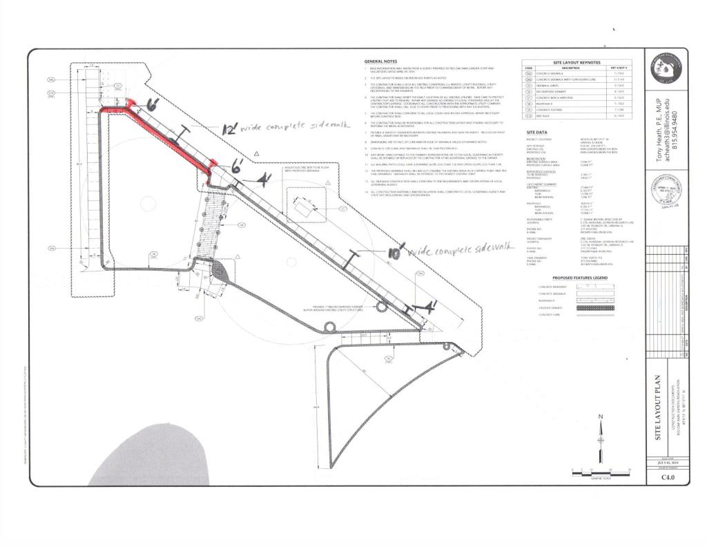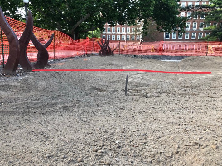 One last issue was made apparent upon my return after eating a late lunch. Stephanie and Josh had just started excavating the base for the north sidewalk width expansion. They said that they were told to dig for a 6′ sidewalk expansion, not the 4′ expansion that was specified in the construction documents. After some discussion, Stacey, Eliana and I agreed that the 4′ expansion width is appropriate to safeguard the London Planetree. So, the width expansion will be 6′ starting at the northwestern point and ending at the boardwalk (shown in red below). It will be 4′ starting at the boardwalk — heading southeast past the London Planetree — and ending at the sidewalk juncture. This revision allows us to keep some of the intended planting plan in this area, which is designed to be beautiful and soothing. I look forward to that!