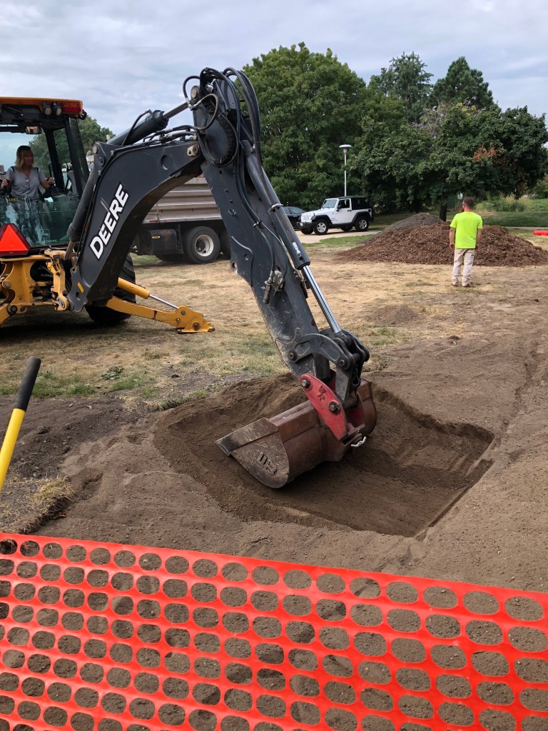 My day started around 7:30 a.m. when I met with operating engineer Stephanie, who was already running the backhoe. She had just started finishing a few areas in the south cell where rough grading wasn’t completed yesterday. I checked in with her to clarify a few things, and I showed her a couple of areas that needed to be raised. One location in particular was about 10″ lower than the plan called for, but by redistributing some of the soil mix in the cell, we were able to get the grading closer to the construction plans. This should give the plants there a better chance to thrive, since they were specified to be drier species and wouldn’t do well in a deep swale.