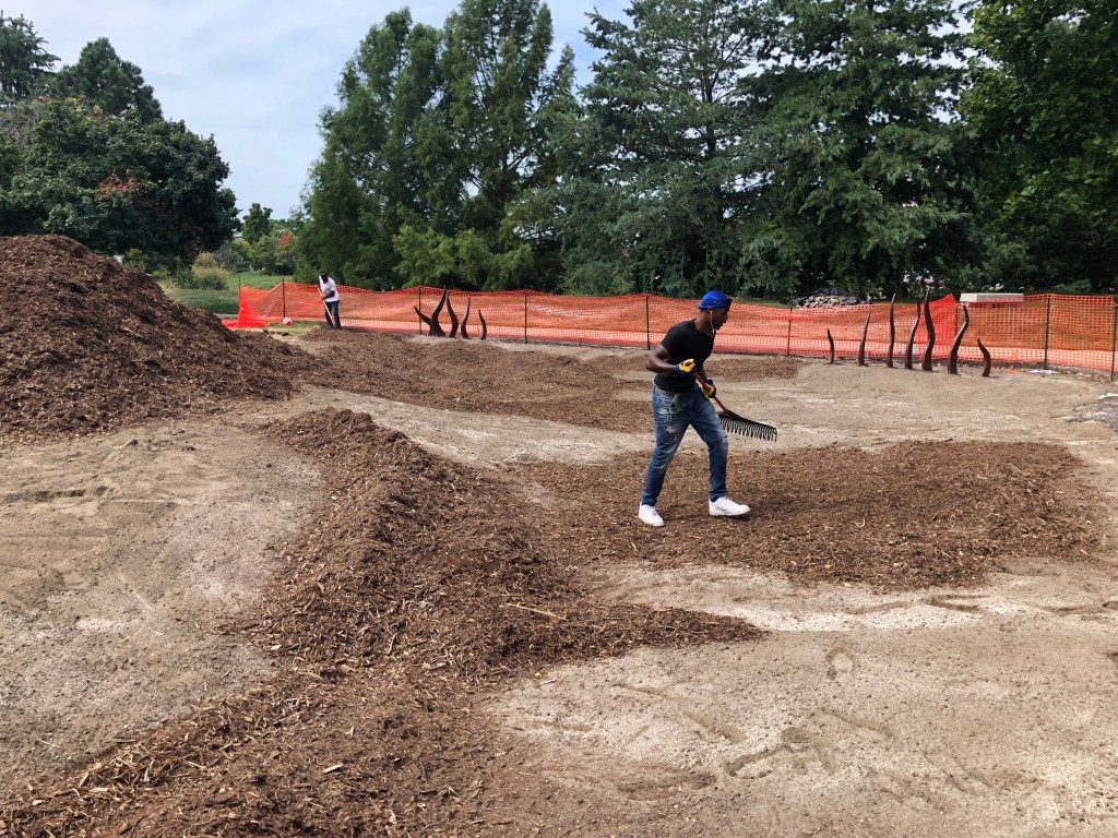 At 11:20 a.m. the Grounds crew arrived to spread the mulch 2″ thick over the entire south cell, leaving an 18″ space clearance on the inside edge of the sidewalk, which will later be filled in with crushed granite bordered by a metal edge. Stephanie perched the backhoe at the southeast edge of the garden and scooped mulch from the pile towards the center of the cell. Again, the crew worked from the inside out, ensuring as much smoothness as possible. Overall, this process went quickly, and they only had a little more to do when they returned from their lunch break.