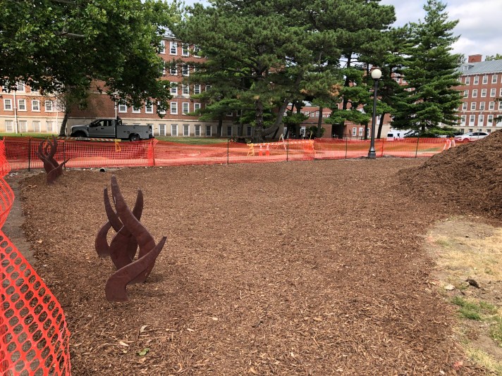 A challenge popped up when Facilities & Services’ Stacey DeLorenzo let me know that we actually only have the parking spaces through Monday’s workday instead of Wednesday’s to allow for early student move-in. The ~50 cubic yards of mulch that we had just finished stockpiling there will have to be moved to the other side of the site, near the south cell. Since it was nearly the end of the workday, Stephanie, Josh and I made the decision to move it on Monday. Later, Eliana spoke to Stacey, who kindly said that we will be allowed to use 2 of the spaces until the end of Wednesday. We can make this work.