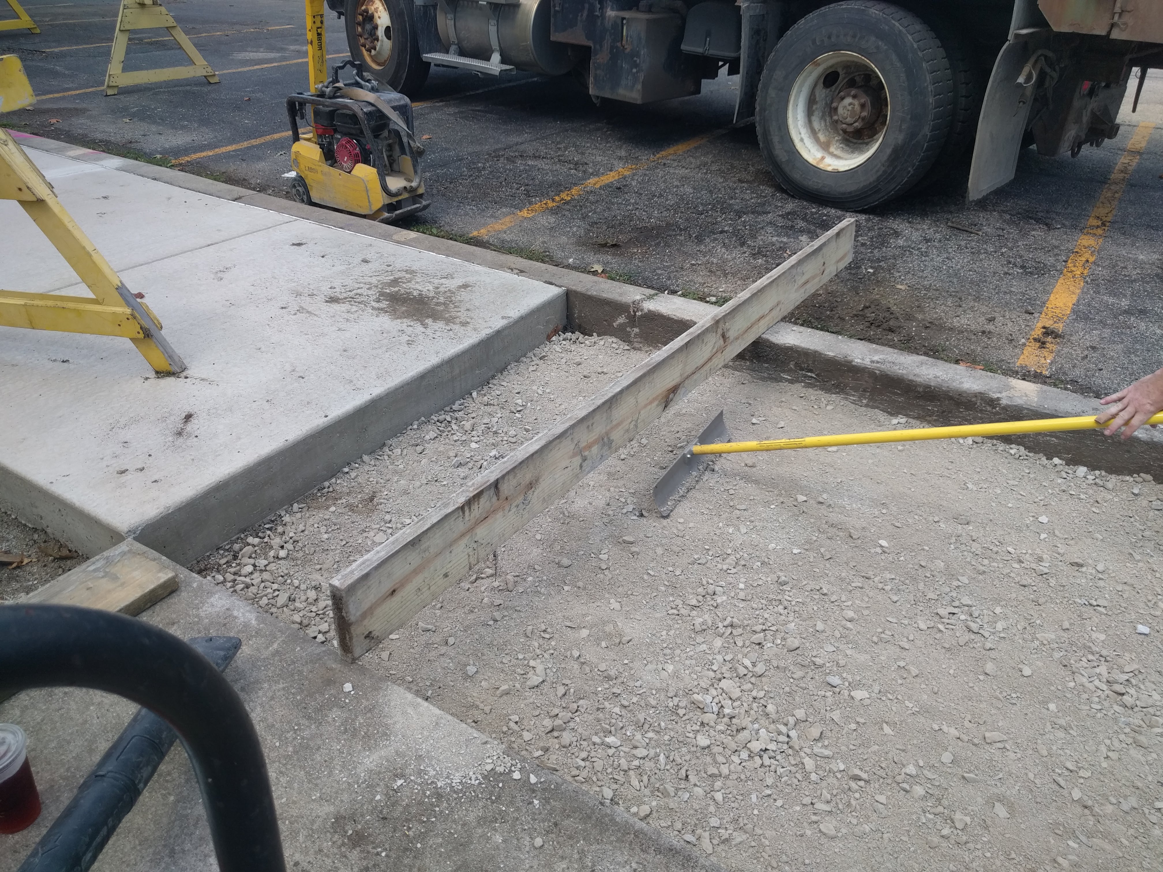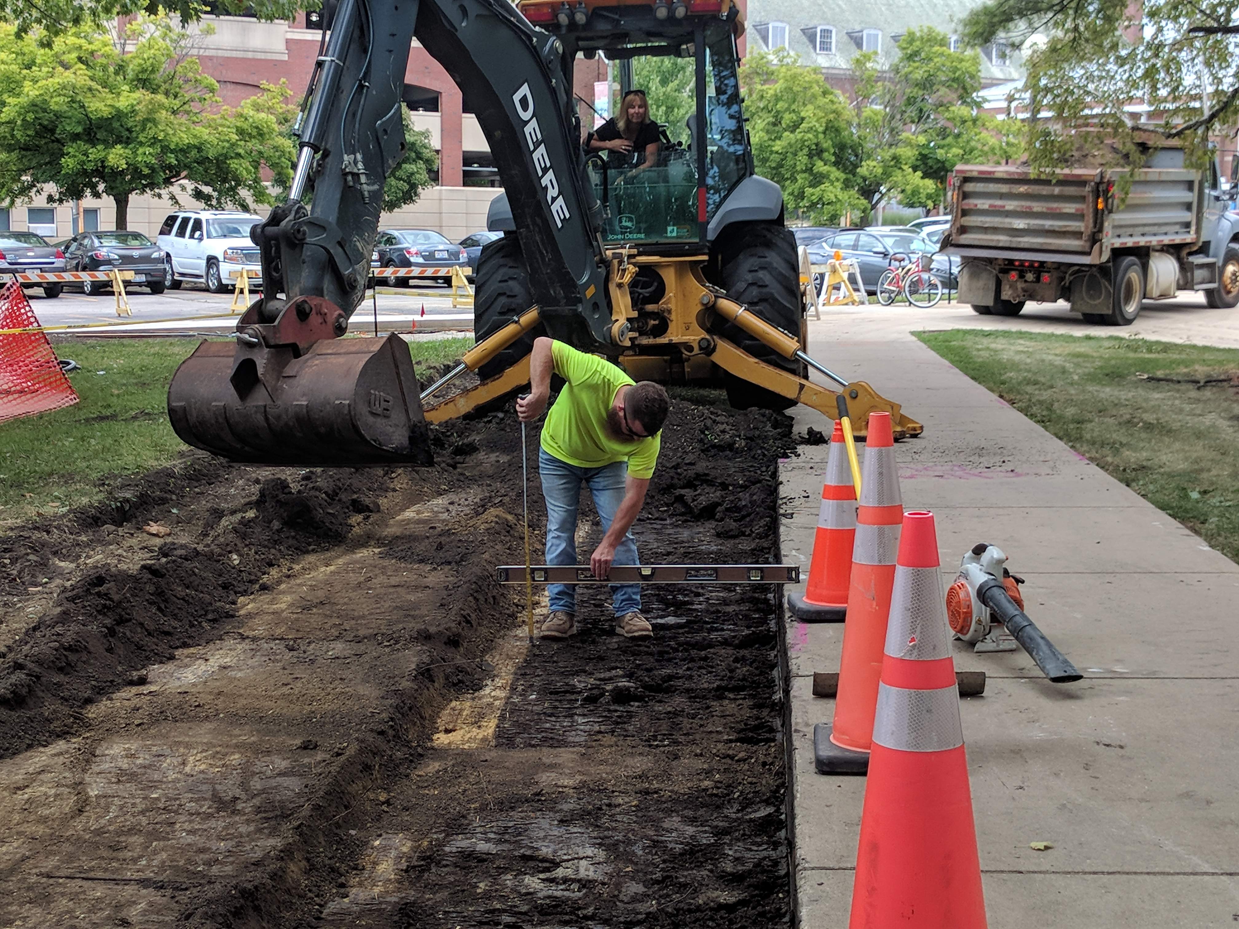 Once the mulch had been relocated, and while Eliana reached out to Brent, construction moved to preparing the last stretch of sidewalk which connects the bike rack area to the new sidewalk along the Allen Hall parking lot. Josh and Stephanie used the backhoe to dig down 10″ to create a level sub-grade for the sidewalk. That 10″ leaves room for 2″ of stone base material and 8″ of concrete. At the University of Illinois Urbana-Champaign campus, all new sidewalks are installed 8″ thick to accommodate the large variety of foot and vehicular traffic that will use them and so that F&S doesn’t have to worry about whether old sidewalks will be compatible with new installations.