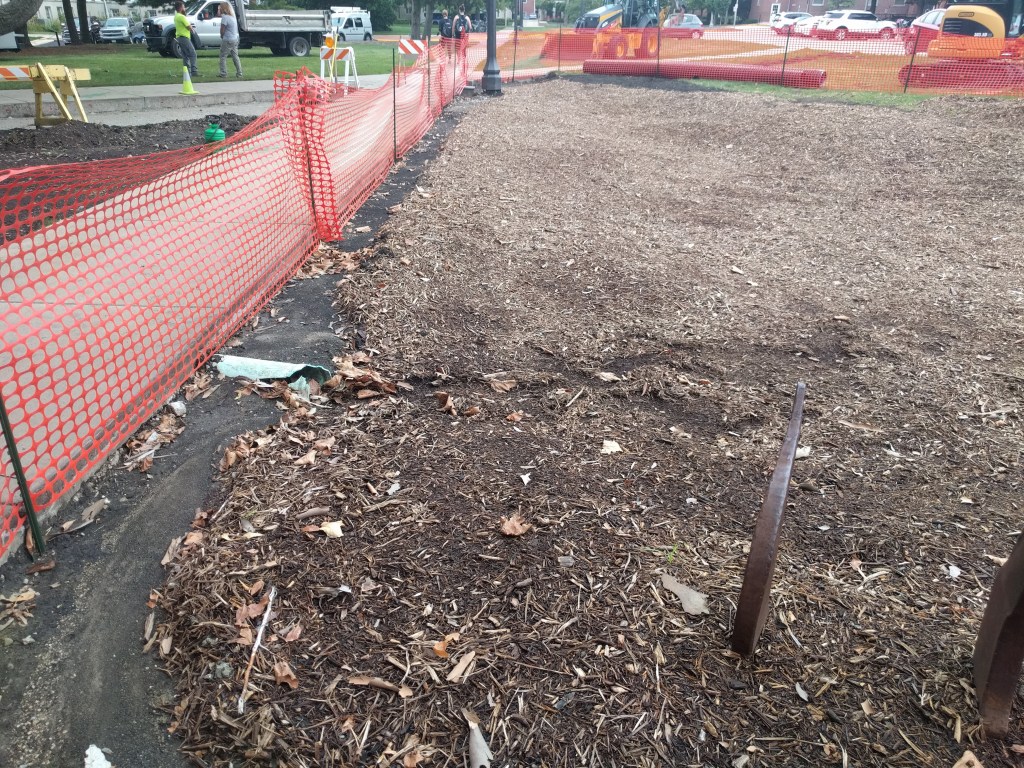 After missing out on Friday due to scheduling and Monday due to rain, today was a big day at the garden as we removed the section of sidewalk between the north and south cells in order to remove the old cracked drain pipe and to install the new 12″ HDPE (high-density polyethylene) culvert.