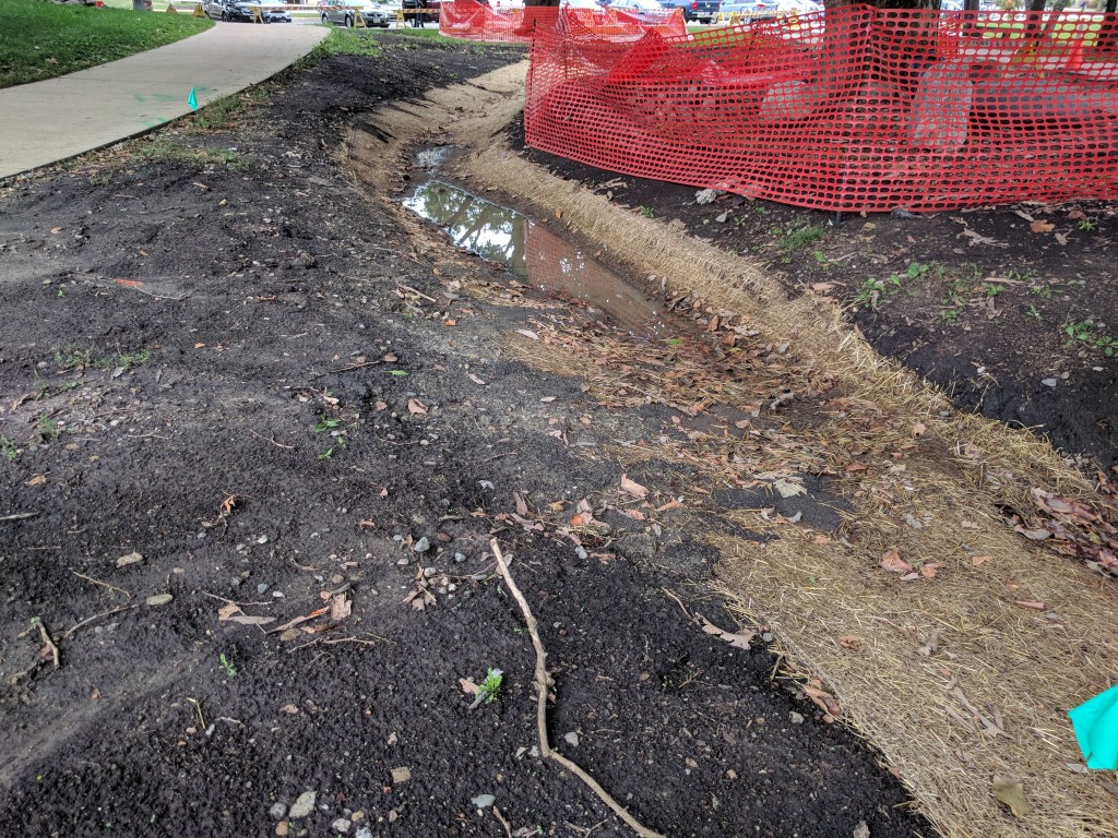 Tomorrow promises to be a busy day at the rain garden as well. We’ll finish installing rip-rap stones at the north end of the pipe and then prepare the bed with sand to make sure our slope is correct before installing the 12″ pipe itself. We’ll also be installing a section of conduit, which will run alongside the pipe and be used to run electrical cabling for the monitoring equipment. We also received our delivery of Filtrexx Siltsoxx this morning, which we’ll begin installing in key areas tomorrow as well. Siltsoxx is an erosion control product recommended by Dr. Rabin Bhattarai, Assistant Professor in the Agriculture & Biological Engineering department. Erosion control is an essential, yet often overlooked, part of rain garden construction. But not for us! We will lay the Siltsoxx around the perimeter of the rain garden to prevent erosion and sedimentation of the exposed areas of soil before we can get the mulch installed and ground cover established. Many thanks to Filtrexx’s Dr. Britt Faucette for helping us with this product. Check back for more information about our experience using Filtrexx Siltsoxx!