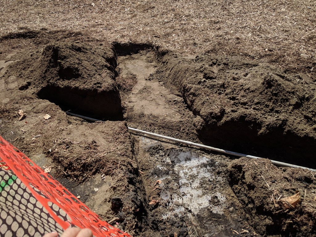 As we were excavating the trench to lay the new pipe, we uncovered the electrical conduit that we had just buried during the initial excavation. It didn’t occur to us then, but the conduit was installed right where the pipe needed to go. Fortunately, the conduit is pretty flexible and to resolve this issue, we raked the mulch back and lowered the conduit so we can lay the pipe on top of it. I should have caught this when they were initially installing it, but the bioretention mix is easy to work with and we were able to get things squared away.
