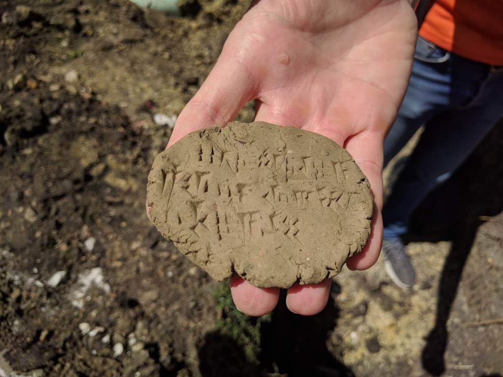 This afternoon, we had a guest come by the rain garden to ask if he could borrow some of our clay! Dr. Ryan Shosted from the Linguistics Department teaches a class on the Hittite language, which was spoken in the Anatolian region of Europe and the Middle East during the Bronze Age. Hittite was written using cuneiform script on clay tablets and is one of the oldest written languages in the world. Ryan was collecting a clay sample to bring to his class, which he was sending out later that afternoon to look for clay so they can practice writing cuneiform on clay tablets of their own.