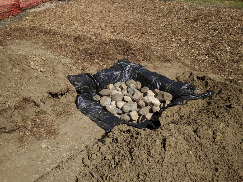 The landscape fabric and rip-rap stones. Photo by Tony Heath.