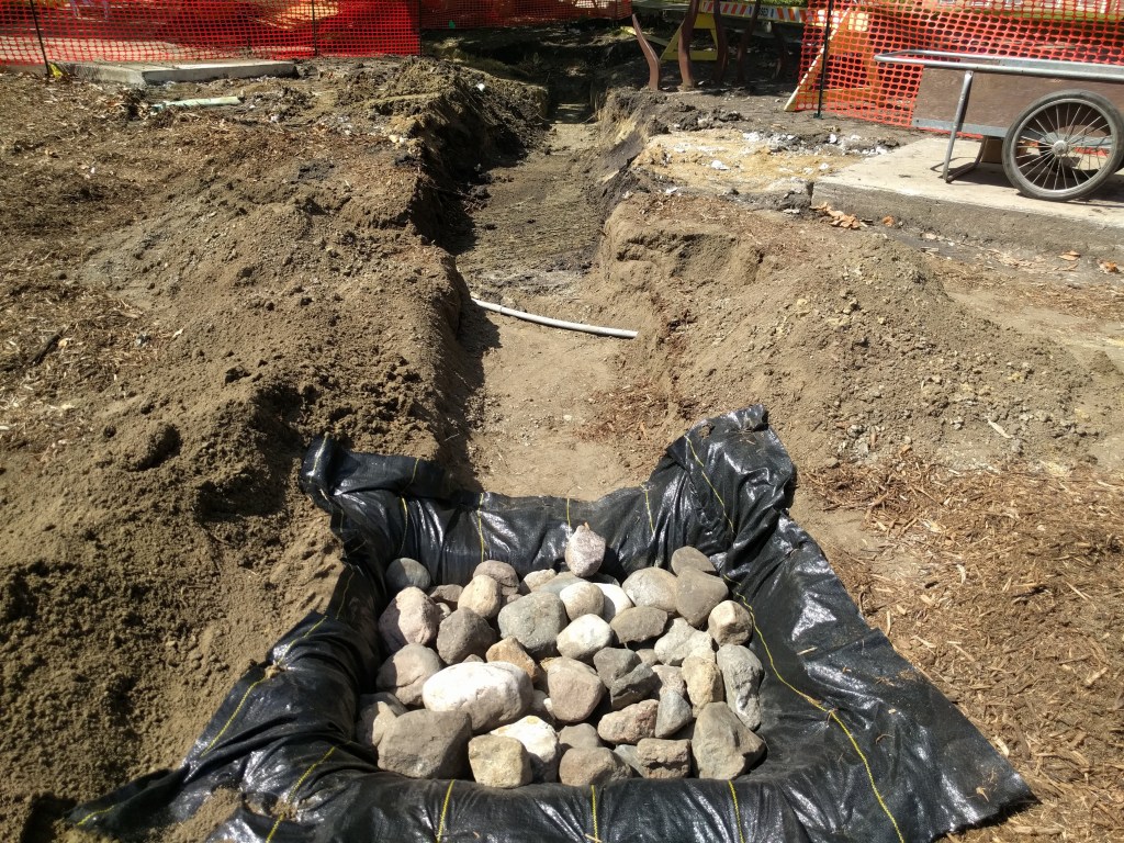 Once the sidewalk was removed, we refocused on the preparing the ground to accommodate pipe installation. As mentioned, we’re placing rocks at the ends of the pipe to prevent washout. So, Stephanie excavated out additional soil near each pipe end for the rip-rap stones. We lined the bottom and sides of these areas with landscape fabric to prevent soil migration into the stones and minimize fouling over time. While Josh and Stephanie dug the trench where the sidewalk had been, I began placing the rip-rap stones. Once the pipe is installed, we will add more stones to fill out the hole and will replace the soil and mulch around it to cover the landscape fabric.