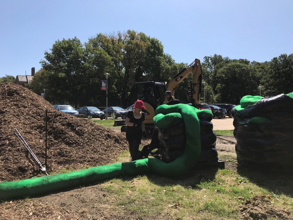 Unlike other erosion eels that are filled with straw, Siltsoxx is filled with compost, which is much denser. The weight has a few benefits. First, the heavier sock is more stable and doesn’t need sand bags or staking to stay in place, unless it’s on a steeper slope or in a concentrated flow area. Secondly, once the site is stabilized, the sock can be sliced open and the compost raked out to provide organic enrichment for the soil. The one downside for me today is that since they are so heavy, it can be difficult to place by hand. Eliana, Kate, and I gave it our best effort. After a few attempts, Eliana muttered something about needing to go back to the gym. Kate had came to the site already down an arm due to a broken wrist so couldn’t provide much assistance. However, she was happy to notice that her cast matched the Siltsoxx. Gratefully, it didn’t take long for Stephanie to offer to call another operator out to the site with equipment to help with installation. Took five minutes tops — which is testament to her kindness and mercy.