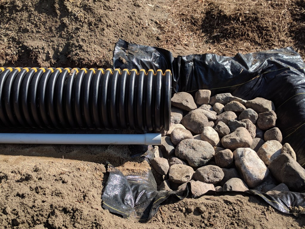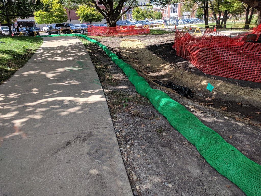 We started the day continuing with our work from yesterday. Facilities and Services’ Josh and Stephanie cleaned up the trench and laid a thin layer of bedding sand for the pipe to lay on, while I continued to place rip-rap stones to serve as outlet protection at each end of the pipe. Once the pipe was in place, we pushed it to the east edge of the trench and laid the conduit for the monitoring equipment alongside of it on the west side. Prof. Schmidt will be out on site Friday afternoon with his CEE 458 Water Resources Field Methods class to place the rest of the conduit, but since this portion needed to be coordinated with the sidewalk installation, we decided it would be best if we did it now. The conduit came in 10′ sections with male & female bell ends. We used PVC glue at these ends to create a watertight seal between sections.