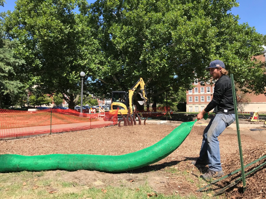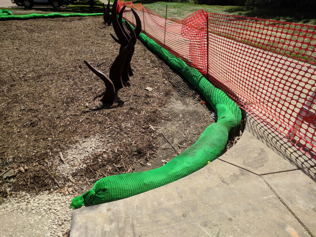 Our Filtrexx Siltsoxx delivery arrived on-site in time for us to install them in the high priority areas. The plan was for us to install it by hand and I needed assistance for this. My first choice was our former construction manager, Eric, who started his new job as SSC Coordinator. But, alas, he was too busy with new duties. Then, I reached out our landscape designer, Layne, to see if he could help, but he wasn’t in town. Finally, I asked Eliana and Kate to come out, thinking that the three of us would be able to handle it before lunch (SPOILER ALERT: we couldn’t).