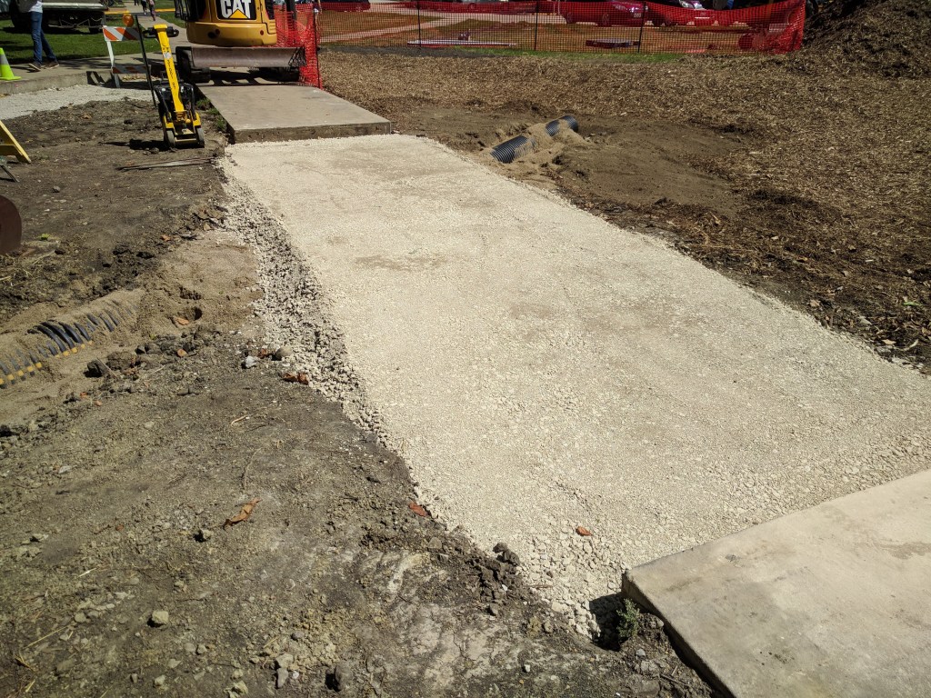 With the sidewalk base ready to go, the concrete finishers will be on-site tomorrow to pour the new sidewalk.Ā Meanwhile, Josh and Stephanie will begin excavating the south edge of the north cell and installing the stone base to prepare for the decomposed granite. The decomposed granite should be delivered on Friday of this week and we’ll begin its installation next Tuesday.