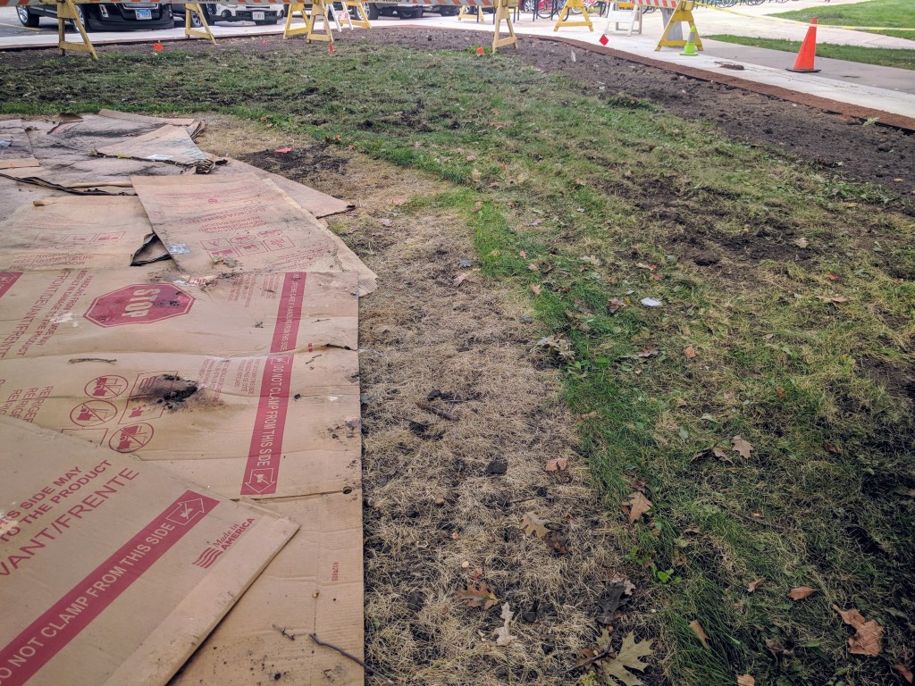 Around 10:30 a.m., Wayne Bugaj from Facilities & Services Grounds arrived on site with the rented sod-cutter to remove the remaining sod in the undisturbed areas around the red oak tree. but outside the area where we laid down cardboard to smother the grass. The sod cutter works by having an adjustable blade that oscillates back and forth, making a clean slice just underneath the roots of the sod.