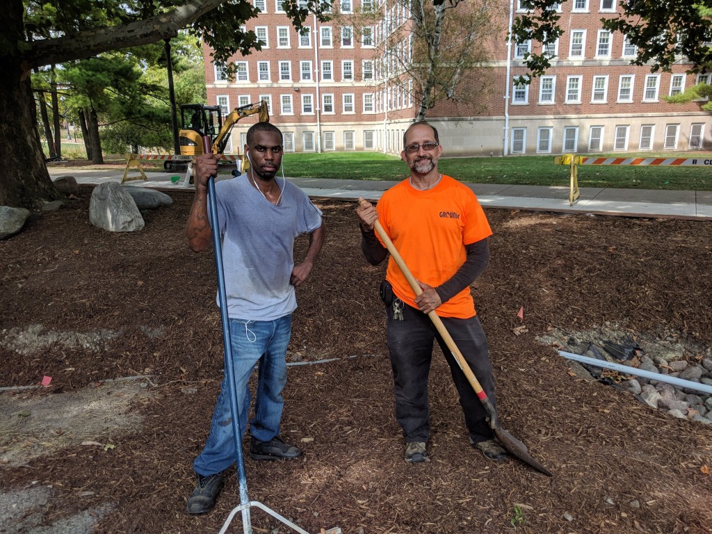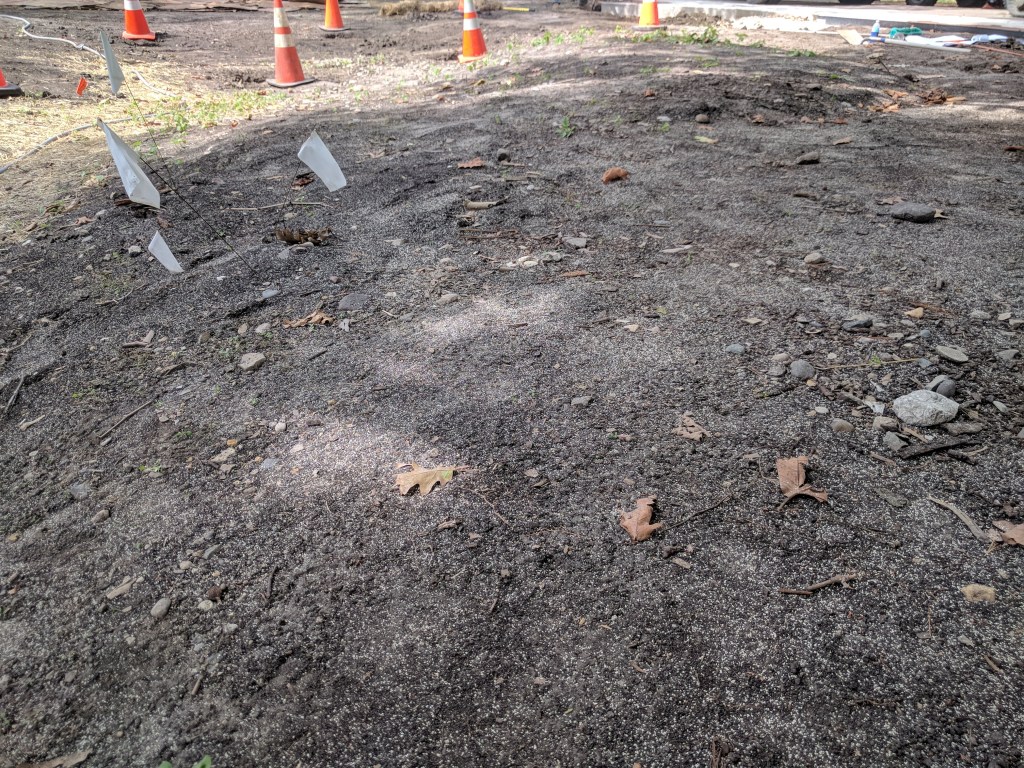 The grounds crew made a lot of great progress today as well. They started the morning by prepping and cleaning up the site, removing stones, raking up the sod from yesterday, removing clay clods from the topsoil that was brought in, and anything else that needed to be done before the mulch covered it all up. While they worked on that, I took the opportunity to spread mychorrizal on the soil before the mulch went in. I spread 2.5 bags across the entirety of the north cell except for the areas still covered by cardboard around the base of the Red Oak tree. We still have a whole bag left, so once we’re ready to put down mulch in that area, we’ll pull the cardboard out, lay down mychorrizal, and at that point we’ll be ready to plant!