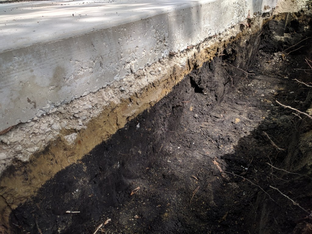 When bringing the excavator in we made sure to stay out from underneath the drip-line of the trees and to only move along a single path beneath the bridge in order to minimize compaction. The borings were 3′-6″ deep and we expected that we would run into clay but to our surprise it was mostly black dirt that came out. The location of the bridge is where some of the longest-lasting shrubs from the original rain garden were located and I suspect that the high quality soil is their doing. The reason that we made these borings so deep is that 36″ is typically the frost depth in the Illinois winter. By digging down below that line we’ll have less heave over time by avoiding the freeze/thaw cycle. The extra 6″ at the bottom are for a stone base that the concrete will be poured on. Once all of the post footings were bored, Josh and Mark began digging out the abutment footing at the north end of the bridge. This will be a thicker piece of concrete that the bridge end rests on and seeing the soil layers underneath the new concrete reminded me of a chocolate and peanut butter cake.
