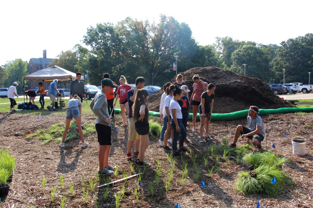 The second half of the day was more of the same – a lot of holes were dug, and a lot of plants went in. At 3:00 p.m., we welcomed our next class to the garden: a large group of Erin Harper’s HORT 100 students came to install plants, and that they did. To prepare for them, Tony and I had pre-drilled 500 holes for the students to plant during their hour of class. I kid you not, they were planted – correctly – in only FIFTEEN MINUTES. It’s incredible the work that can be done by many hands. To make things go a little faster on my end, I recruited two students to help drill holes, while I placed a special mix of some stunning Common Rush, Juncus effuses, from Possibility Place Nursery, Irises, Turtlehead, and Marsh Marigold at the bottom of the swale behind them. Groups of students came in behind me to plant everything I placed. By the end, it was I that was rushing.