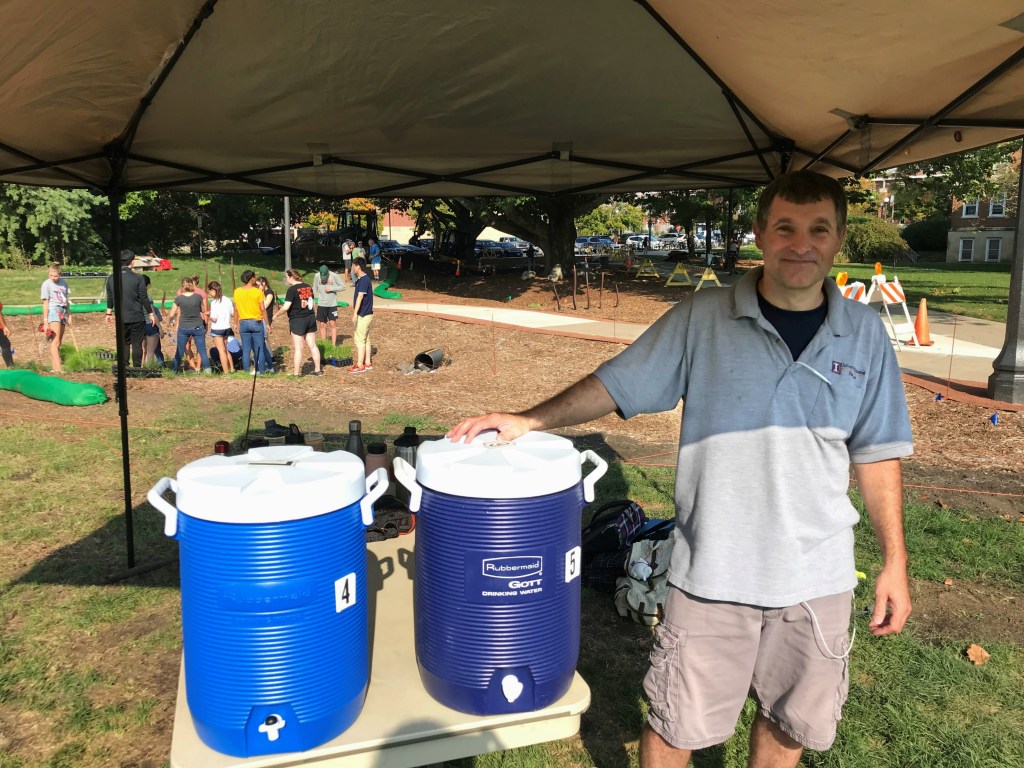Our colleagues at the County Extension Office loaned us coolers so we could provide volunteers with water on-site. While the assembly line of planting was going on, Kate went to fill the coolers with water. John Artis, pictured below, saw Kate struggling and brought her to the Lincoln Avenue Residence Hall cafeteria. He introduced Kate to the cafeteria workers and explained that she needed the water for a student project just outside the building. He filled up both coolers with ice and water and helped her cart them outside. He even lifted them up and set them on the table! John is a University of Illinois F&S Building Service Worker at LAR. Kate said he would ask how the project was going whenever she would see him in the hall and checked if we needed anything else. John is the best!