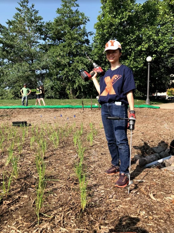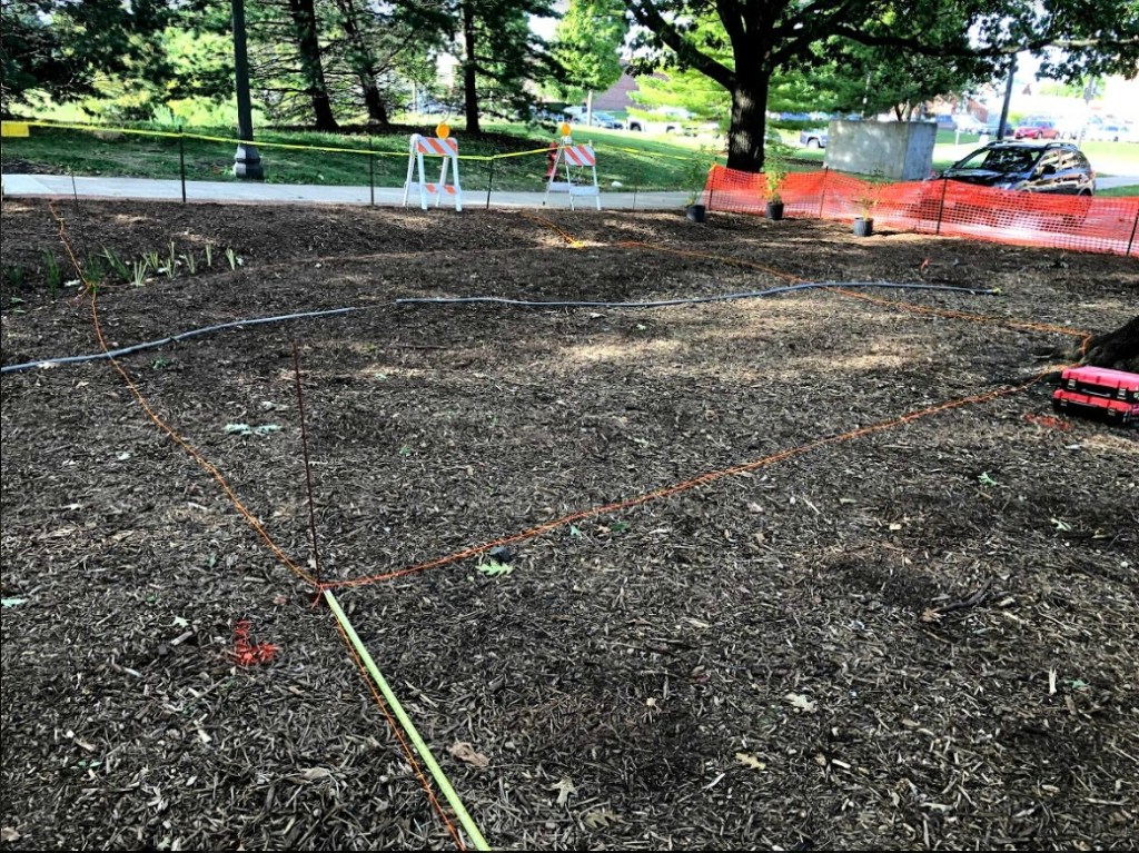 TRANSLATING THE PLAN TO THE GROUND: On Sunday evening, with the planting plan in hand, Sonny Thompson, (best) Friend of the Rain Garden, and I set up a 20′ x 20′ grid using string and stakes. Following that, I translated the “drift” lines from the paper plan to the physical space using spray-paint. It was incredibly exciting for me to see lines I had drawn a full year ago appear on-site for the first time. To prepare for the volunteers arriving the next day to start installing plants, I began drilling holes in one of the squares. Throughout the planting process, we are using two drills provided by Facilities & Services’ Grounds department and a 2″ diameter auger attachment. I ended up drilling about 100 holes for Prairie Dropseed that evening. Because we began work in Cell One (the southern cell), where the soil was the bioretention mix called for by our own Tony Heath, the soil was soft and very easy to drill.