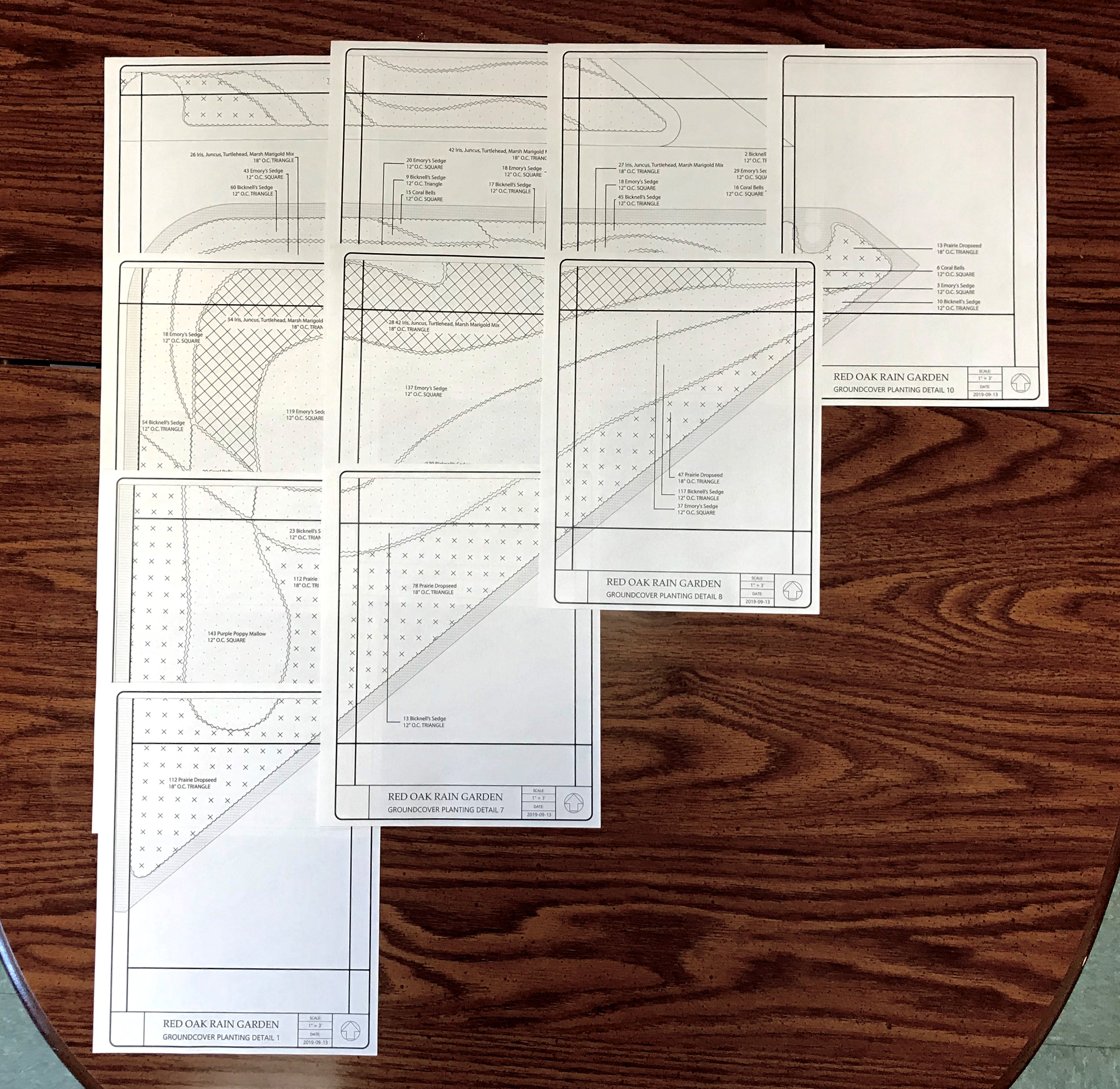 PLANTING PLAN: I finished the final edits to the garden’s planting plan. One of the garden’s goals is to be volunteer-friendly with their maintenance in mind. Thus, establishing a dense groundcover quickly to help shade out weeds that pop up is a priority. As such, the number of groundcover plants is much greater than the numbers of “structural” plants and “seasonal interest” plants so, the planting plans printed for installation only covered the groundcovers. Thousands of plants were arranged into large drifts that correspond to unique conditions – i.e. moisture and sunlight requirements, etc. The drifts are within a large grid that overlays the entire garden plan, with plants placed 12″-18″ apart depending on the eventual mature size of the plant.