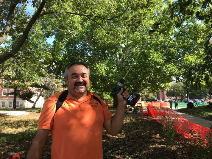 Due to my foot injury, we had to get a little creative with moving the project forward. While I was still able to hobble around to paint out lines, pop and place plants, and coordinate volunteers, I was unable to continue one of the most important aspects of the installation – drilling holes. Luckily, Eliana — who was also injured (sprained ankle) — connected us with three great volunteers, Jim Payne, Brendan O’Shaughnessy, and Bill Handel, who came out to drill with Tony. This really helped speed along the planting process later in the week. Monday was dedicated to just this task, so we’d be prepared for more volunteers into the Tuesday and Wednesday timeslots. In just a few hours, hundreds of holes were drilled!
