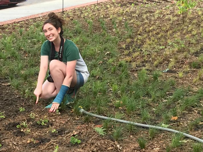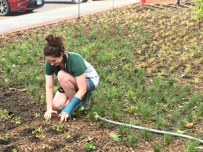 Student volunteer Tony Rudawski (aka Tony “B”), Eliana, and I planted the final drifts of Compass Plant (Silphium laciniatum), Pale Purple Coneflower (Echinacea pallida), Black Eyed Susan (Rudbeckia fulgida), Royal Catchfly (Silene regia), and Pussytoes (Antennaria plantaginifolia). These species all went in sunny areas of the garden in Cell 1 and Cell 3. Eliana was in a boot due to her injury, but was able to plant in Cell 1, which has a gradual slope so she could sit down to plant. She was thinking that we really needed one more person to help get this done, but didn’t know how to make that happen. Then, a little miracle. While in Cell 1, she looked up, saw a student who she thought was Kate’s sister, so she said hello. The student was NOT Kate’s sister but our newest volunteer, Elsa De Becker! Turns out Elsa is a ACES grad student who wanted to help out with the planting. She immediately joined our effort and the work was done in no time.
