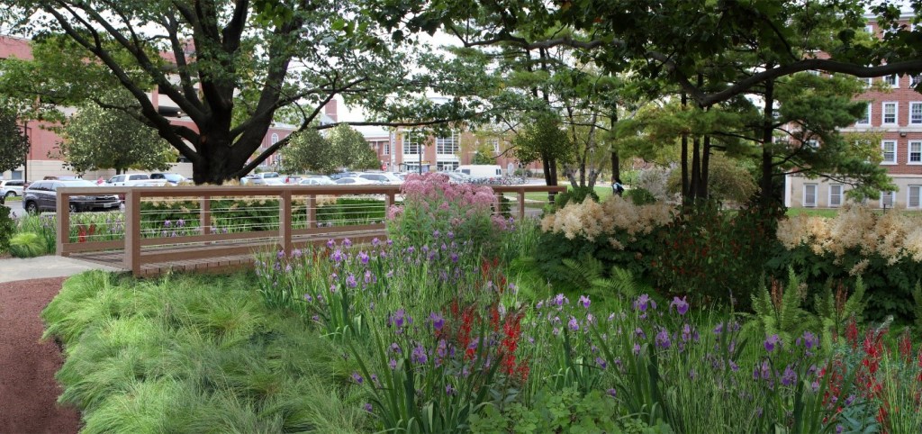 A rendering by Layne Knoche depicting the Red Oak Rain Garden at maturity.