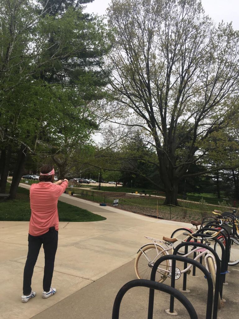 To take these measurements Rebecca and I took a ruler and walked a little over 100′ away from the base of each tree. We then took the ruler (b) and letting it dangle vertically we moved it back and forth in front of our face until the top and bottom of the ruler were aligned with the top and bottom of the tree. We then measured the distance from our eye to the base of the ruler (a) and the distance from our eye to the base of the tree (A). Then, we could estimate the tree height such that B = b*(A/a). While American Forests recommend a more precise method for their Champion Trees using laser range-finders, this method gives us an accurate enough measurement for our purposes. Using this method we estimated that the red oak is approximately 70′ tall and the sycamore is approximately 88′ tall.