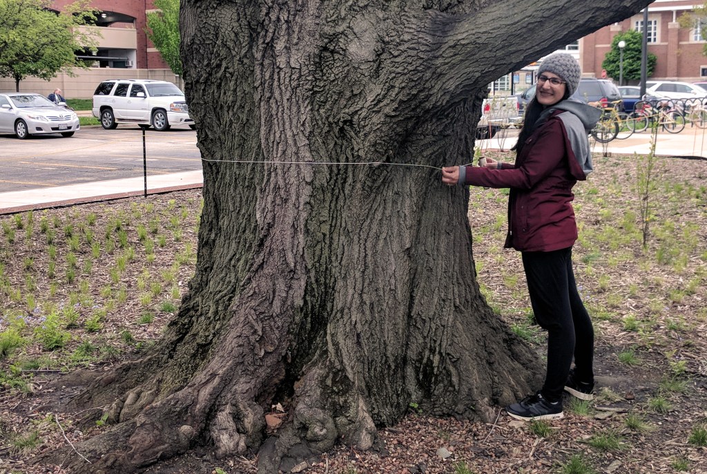 The circumference (or girth) of a tree is the simplest measurement to take, especially for the Red Oak Rain Garden’s trees which are both upright and on level ground. The circumference is measured by taking a measuring tape and wrapping it around the trunk at approximately 4.5′ above mid-slope of the tree’s base or about chest height. If the tree has any large knotty growths, burls, or limb extensions measure at the smallest circumference between 4.5′ and the ground. One person usually can do this measurement, but another person is helpful for large trees like the 100 year old RORG “sisters”. Rebecca Martin, recent MUP/ACE graduate and my partner, graciously agreed to help. To get a precise fit, we used a piece of string wrapped around the trunk of the tree at chest height and then measured the length of the string. Based on these measurements, the red oak has a circumference of 152″ and the sycamore has a circumference of 165″.