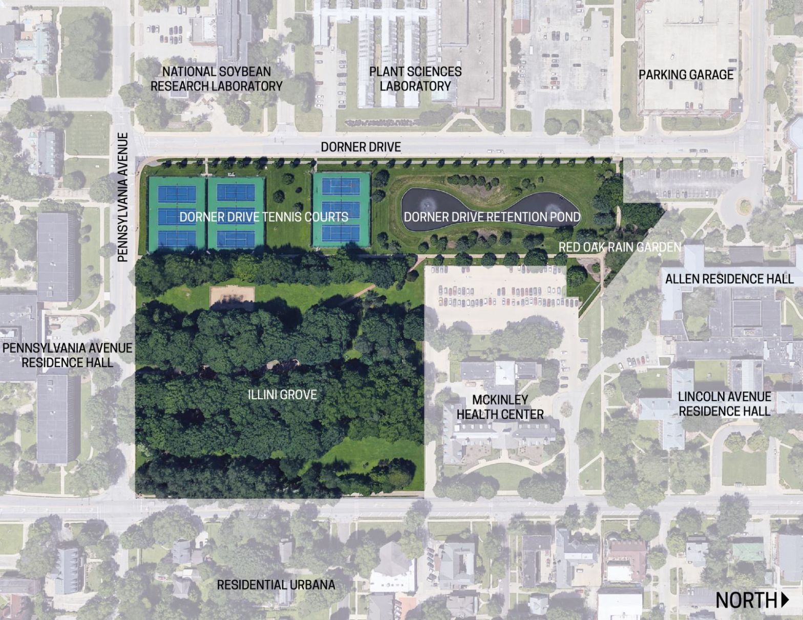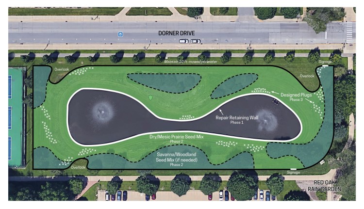 In addition to the Red Oak Rain Garden, this grant includes improvements for its “neighbors:” Dorner Drive Retention Pond and Illini Grove natural areas. It makes it possible for these spaces to become landscape sustainability demonstration sites. Further, when the projects are completed, we’ll have two more spaces to add to the Bee Campus pollinator map. Since these spaces are contiguous, they form a green corridor, which is important for wildlife.