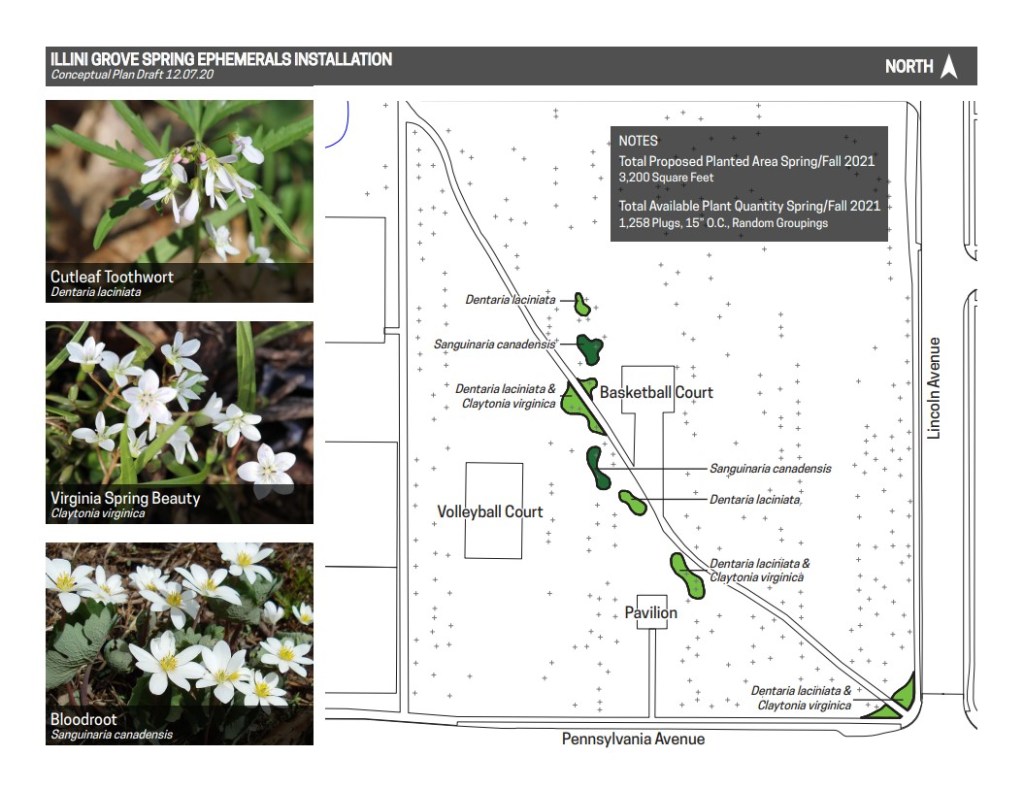 Illini Grove was planted in 1871 as part of a ACES Research project. As such, it’s nice that we, as ACES Extension employees, get to play a role with it again. Much of the understory is grass and the grant allows us to add ephemerals. RORG’s designer Layne Knoche worked with campus landscape architect Brent Lewis on the plan. These plants will emerge in the spring, providing much needed nectar for early-season pollinators. As ephemerals, they will “disappear” in time for the first mowing.