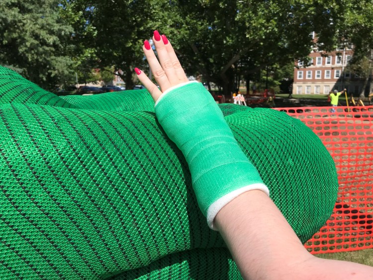 Of course, during the plant installation it was all hands on deck and we had no choice: Kate had to be outside. She hated it (she really did) but no one knew because of her professionalism. She was somehow able to smile and do what needed to be done. Making it more challenging, though, Kate broke her arm while attempting an Irish jig at a non-work event. The only upside? The first version of her cast bore a resemblance to the Siltsoxx erosion control!