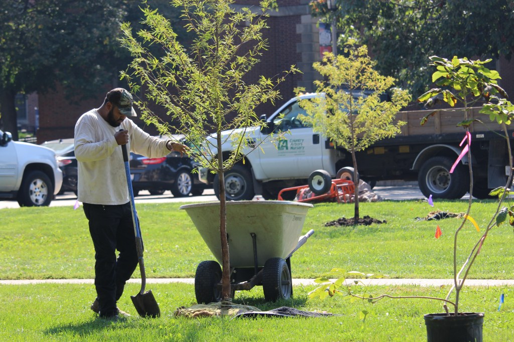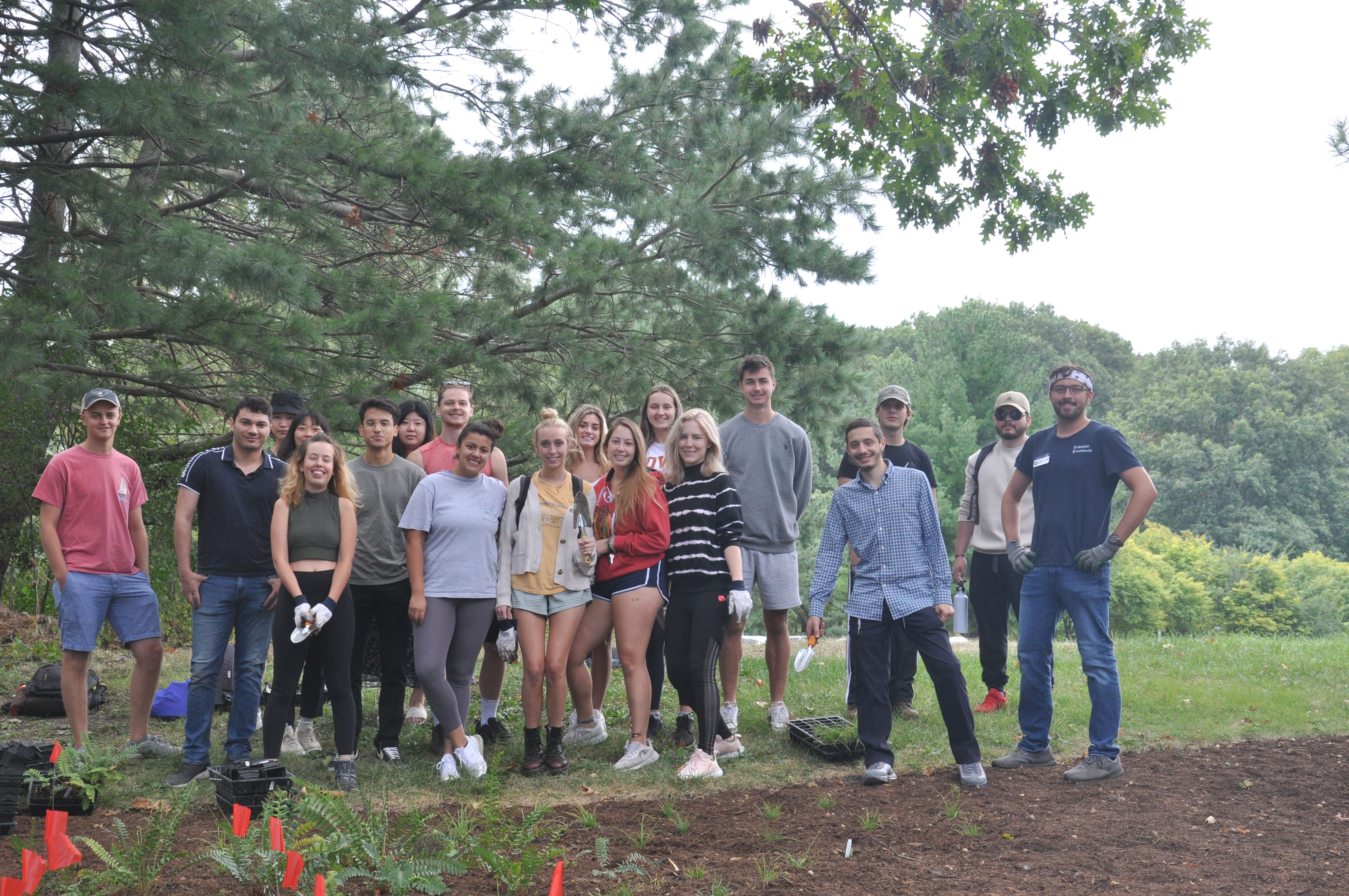 To draw the new garden’s boundary, Layne consulted with Brent Lewis and Ryan Welch of UIUC Facilities & Services. The space encompasses 2,000 square feet of what had been poor-quality, mowed grass, and weeds. There also are three trees: two pines and a mature Red Oak tree.