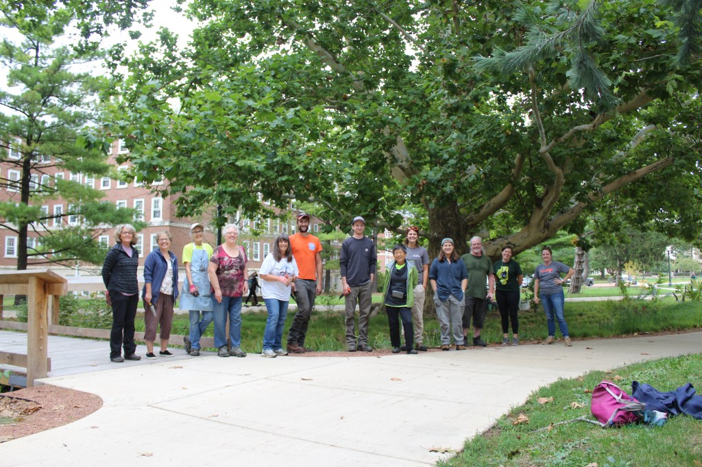 Later that week, RORG’s regular community volunteers (and a few newcomers) from the CCMG and ECIMN programs installed some of the larger plants, such as ‘PowWow Wild Berry’ Coneflower, Sweet Coneflower, ‘Dark Towers’ Penstemon, and ‘Hummelo’ Betony. Another class, Andrea Faber Taylor’s Horticulture 344, arrived shortly afterwards and installed hundreds of plant plugs. In total, approximately 500 plants were installed that day.