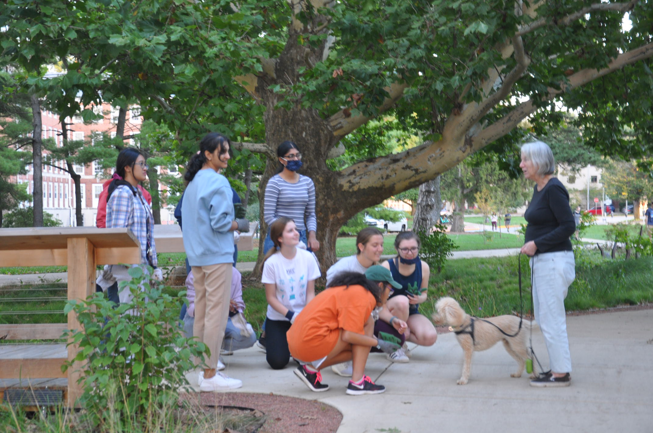 Finally, planting wrapped up for 2021 with the Society of Women Engineers (SWE)‘s service learning event. They installed hundreds of ‘Prinses Irene’ Tulips, which are the perfect shade of UIUC orange. Eliana, who is a Civil and Environmental Engineering graduate, gave them a tour of the garden. She encouraged them to see rain gardens as an opportunity for engineers to work collaboratively with landscape architects and others to create functional spaces of beauty that become community amenities. Later, the event ended with a delightful visit with one of RORG’s canine friends.