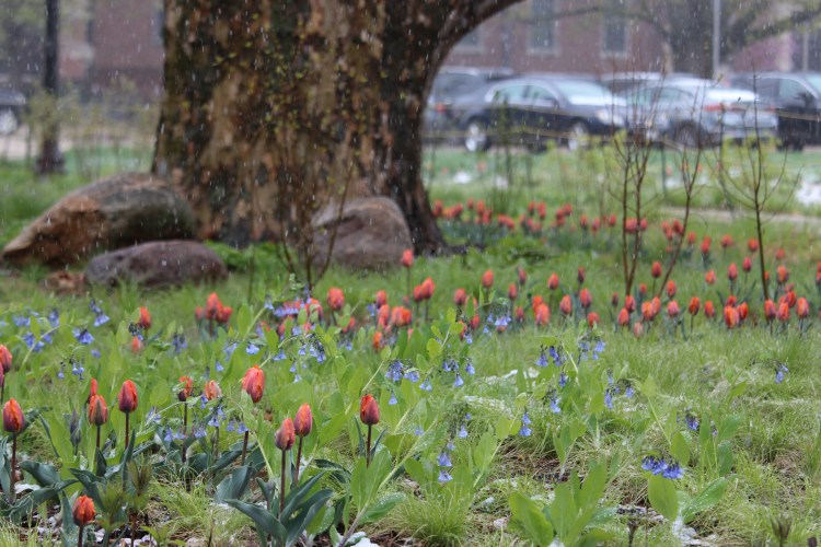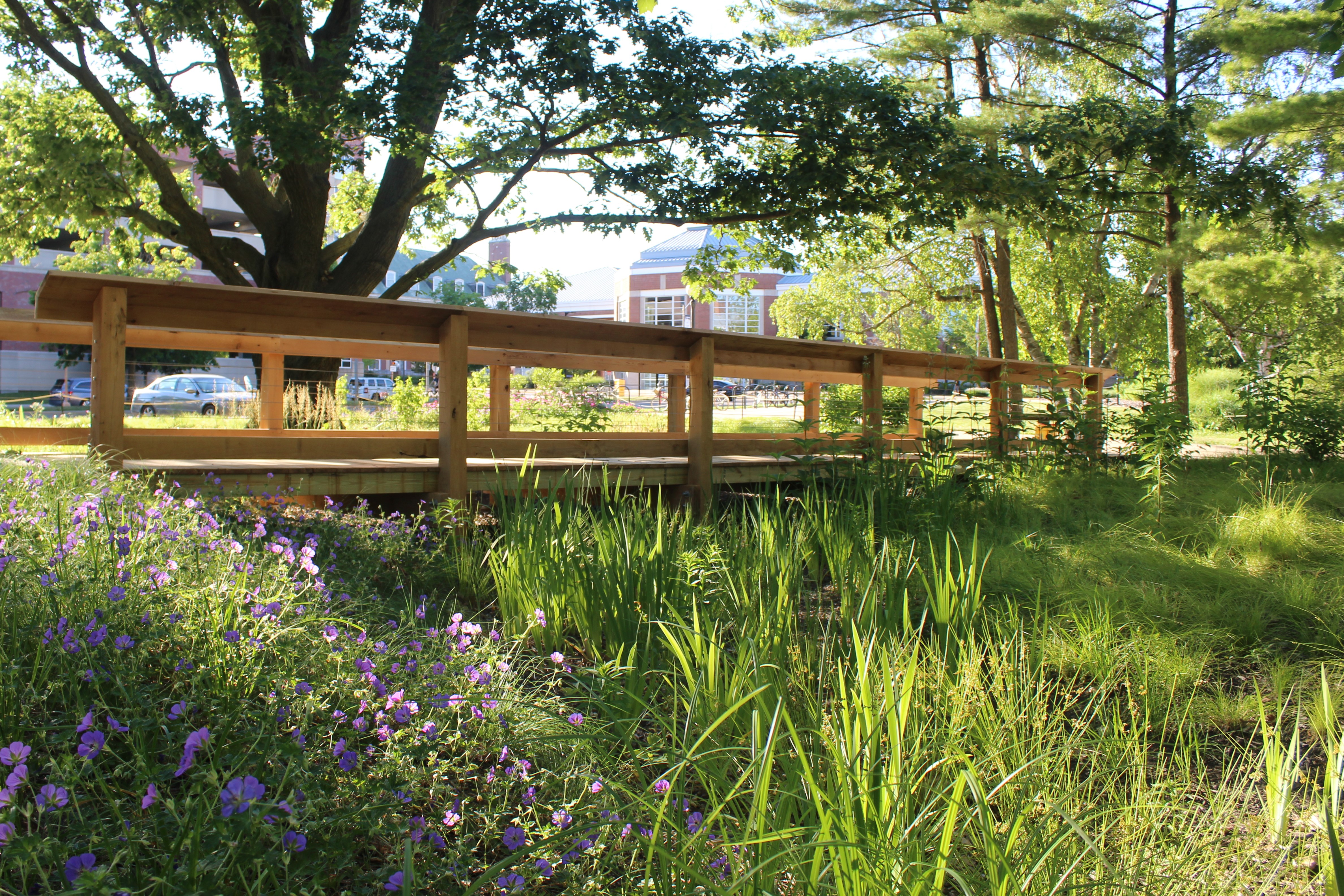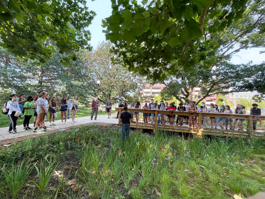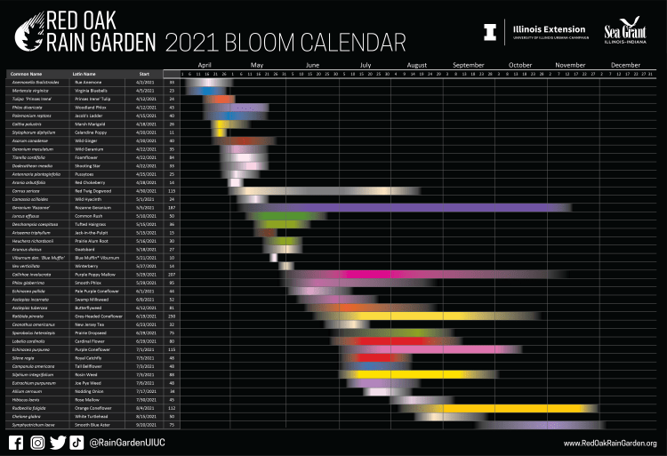 The garden performed beautifully in 2021! Thanks to the hard work, adaptiveness, and dedication of the team and volunteers, the garden has a bright future. The bridge, which has already proven itself popular with the campus community as a photo op, is functioning exactly as designed – people no longer have to cut through the garden while passing through. The plants, and especially the groundcovers, were “creeping“ quickly through the garden creating a dense layer of “green mulch“, and the addition of spring-blooming ephemerals captured the attention of the public and supported early season pollinators. Through the growing season, we kept track of the start and end bloom dates of each species in the garden. Click here to see the full resolution 2021 bloom calendar.