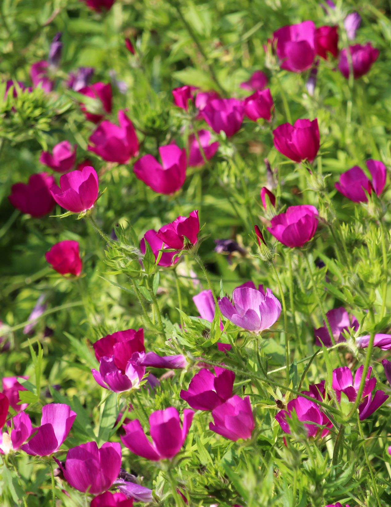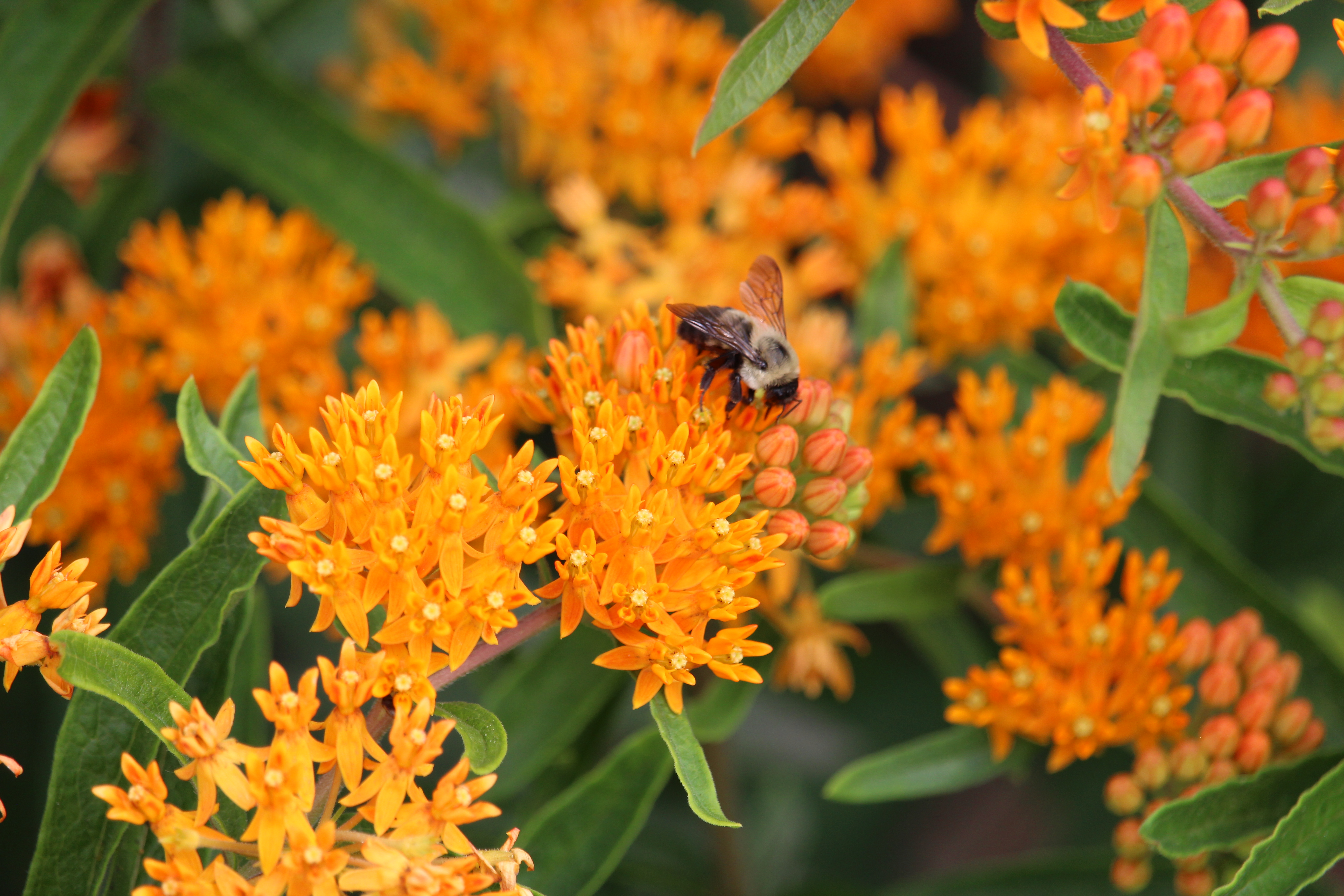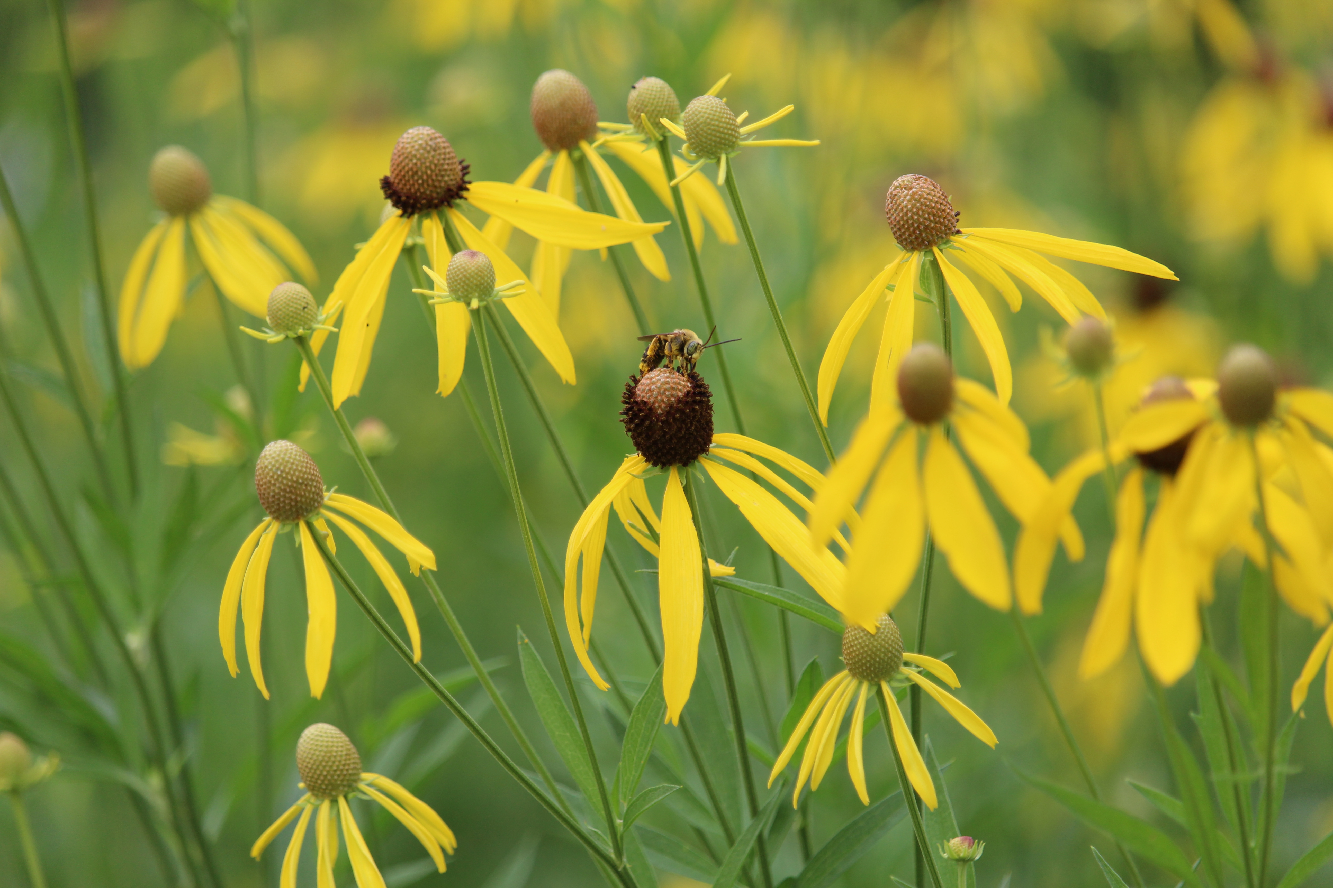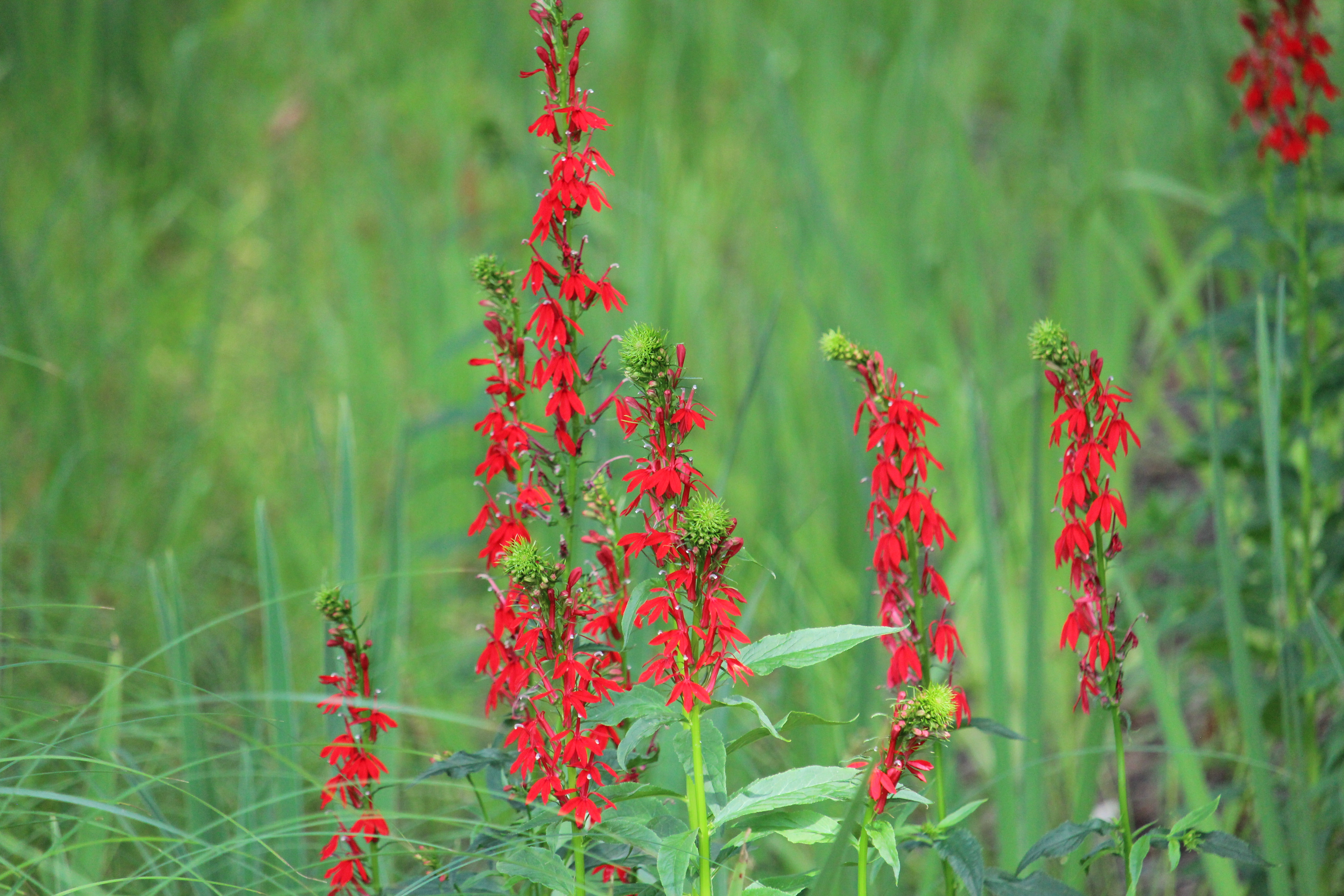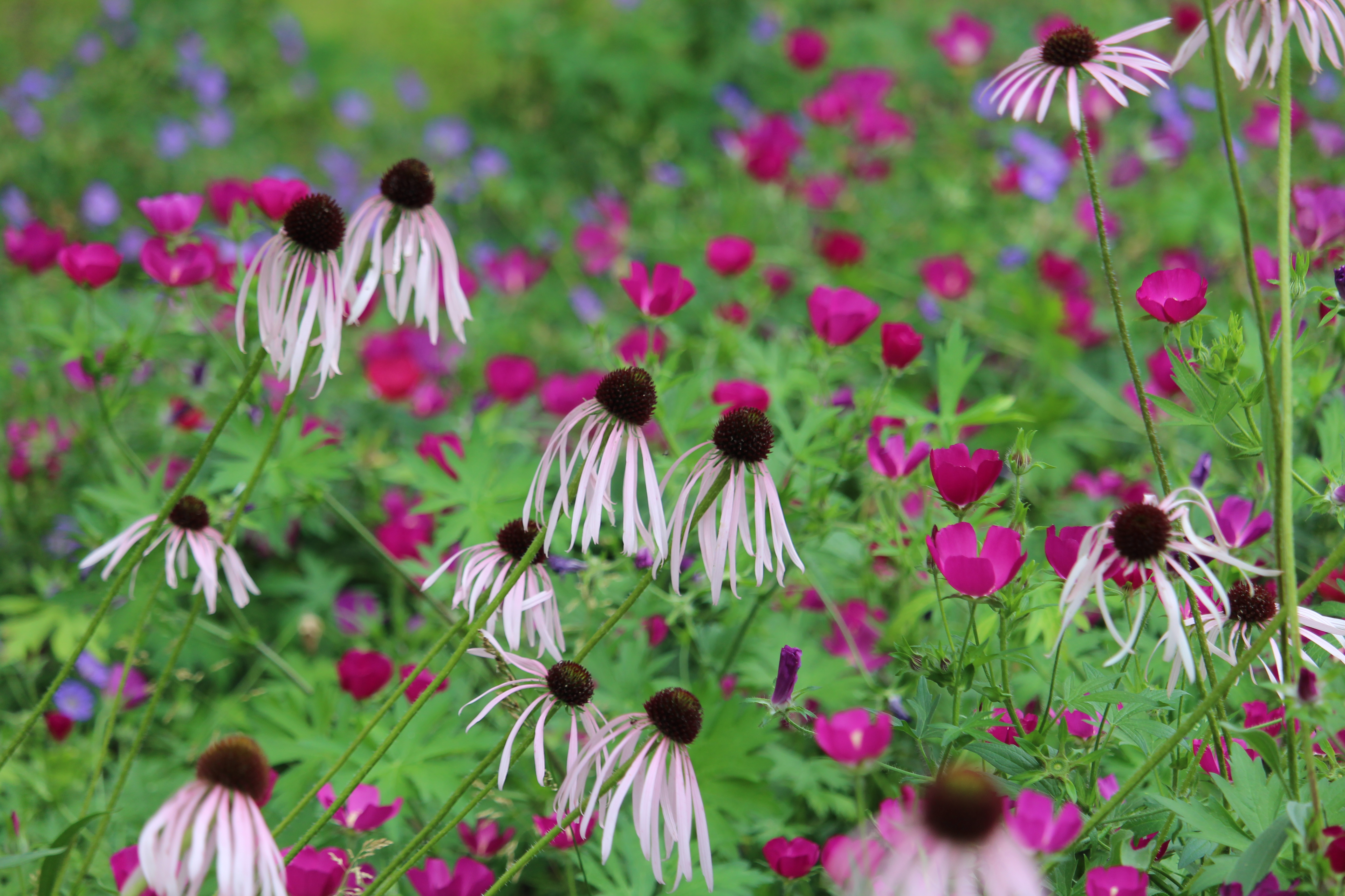 Spring blooms faded and summer blooms took the spotlight as species like Southern Blue Flag Iris (Iris virginica var. shrevei), Purple Poppy Mallow (Callirhoe involucrata), Pale Purple Coneflower (Echinacea pallida), ‘Rozanne’ Geranium (Geranium ‘Rozanne’), and Butterflyweed (Asclepias tuberosa) hit their peak bloom in June and July. Grey-Headed Coneflower (Ratibida pinnata), Royal Catchfly (Silene regia), Cardinal Flower (Lobelia cardinalis), Rosinweed (Silphium integrifolium), Orange Coneflower (Rudbeckia fulgida), and Purple Coneflower (Echinacea purpurea) were soon to follow. A notable addition to the 2021 summer blooms were those of Nodding Onion (Allium cernuum) which performed beautifully after being installed in fall 2020.