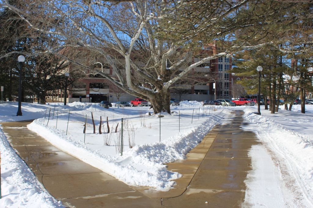 Across the rain garden, 53 native species are represented, making it an excellent showcase of native plants in landscaping. However, the garden is surrounded by sidewalks and parking lots filled with passing students and the bustle of campus, making deicing a necessity this time of year.