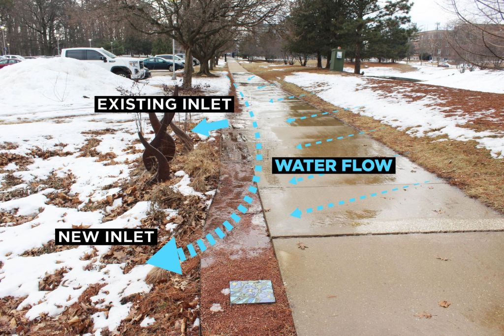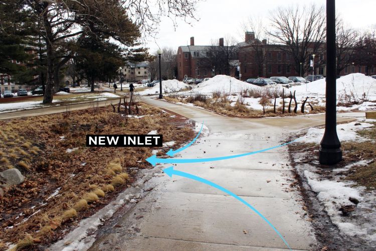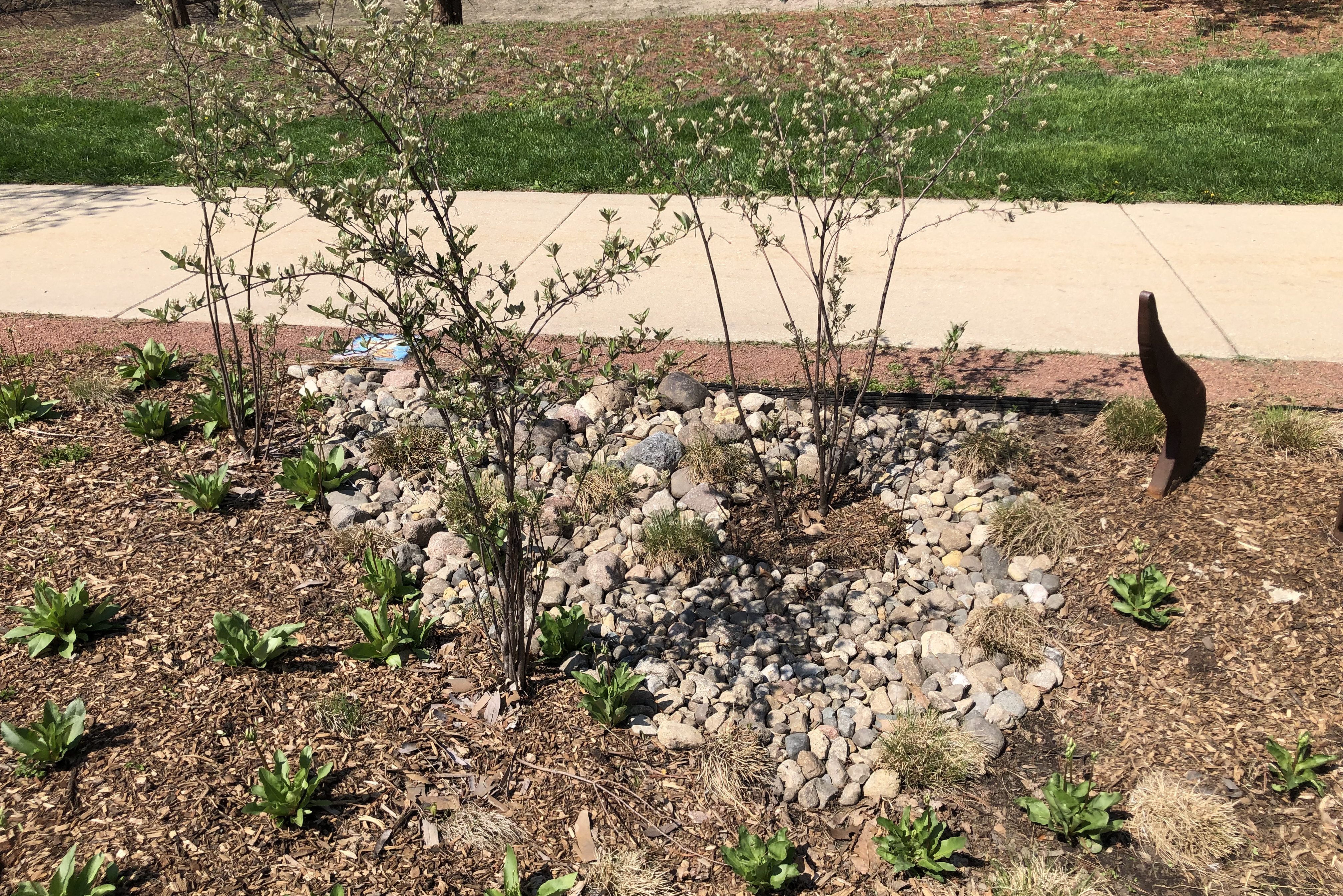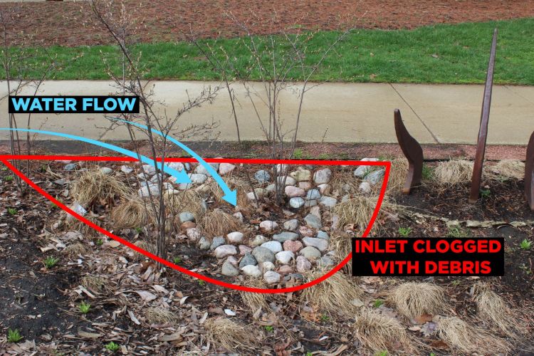 While the RORG Team and volunteers always keep an eye on the garden’s needs for upkeep and design edits, spring is a critical time to perform inspection. Winter can be rough on a campus rain garden. While snow may cover up some issues, snow melt and spring rains reveal places that need attention and if found, we can fix issues before they become bigger problems.