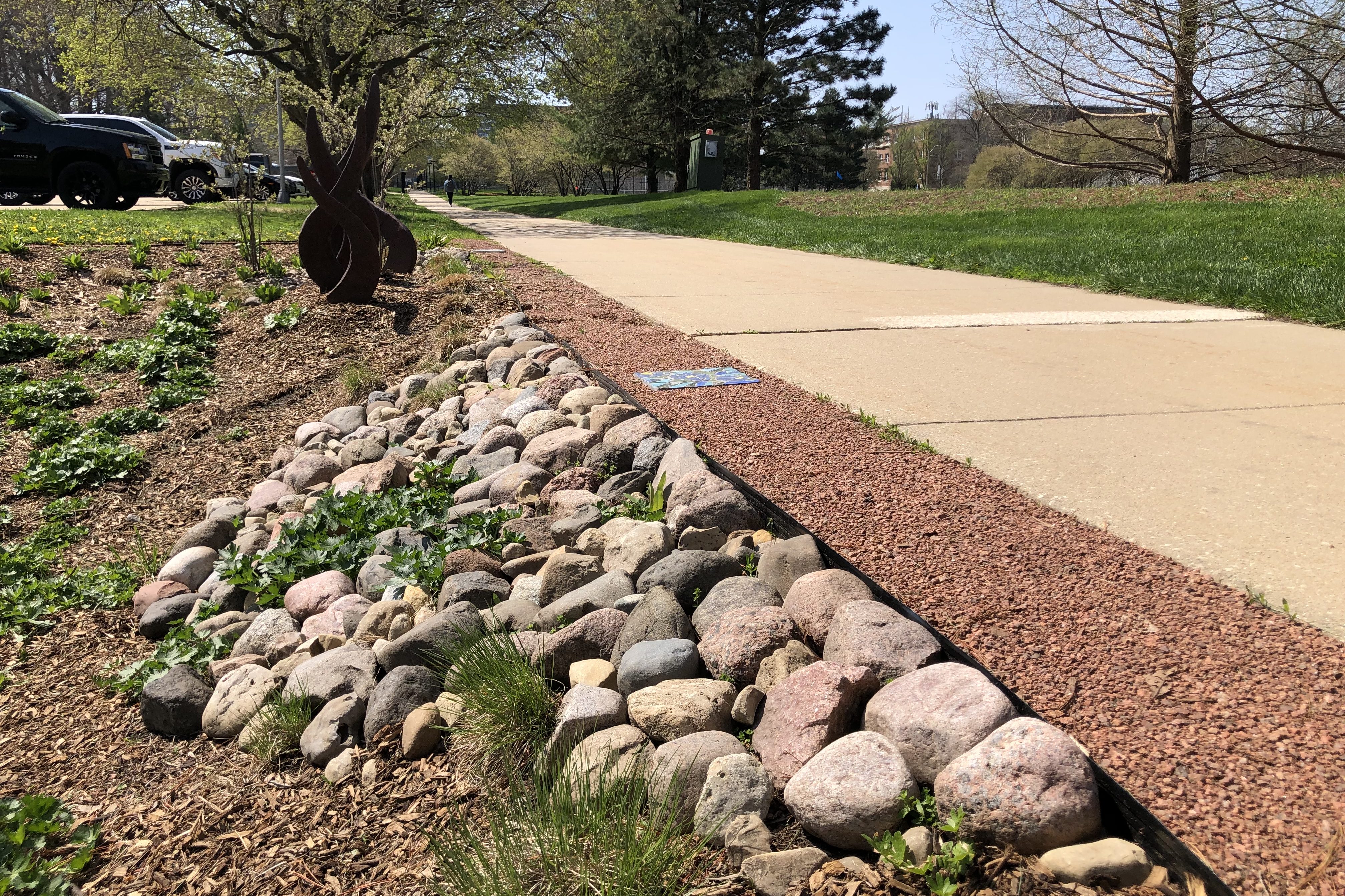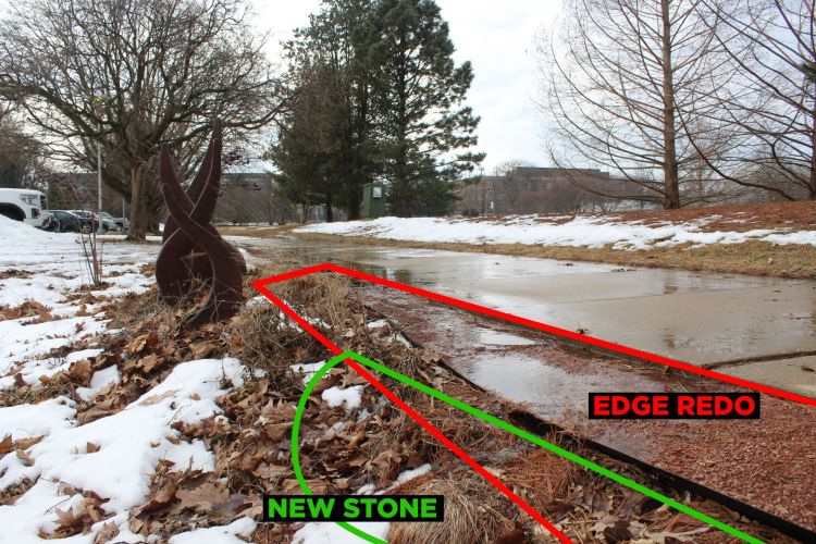 The RORG Team also took care of the rain garden’s hydraulic health. As a rain garden, rainwater flows in and through it. Eliana’s early season inspection noted erosion at the inlet which had to be addressed to prevent further damage. Layne did the repairs himself! The pipe under the sidewalk also needed its annual clean out, which Facilities & Services did. These kinds of maintenance tasks help to ensure that we continue to have a properly functioning rain garden. Read about these issues here.