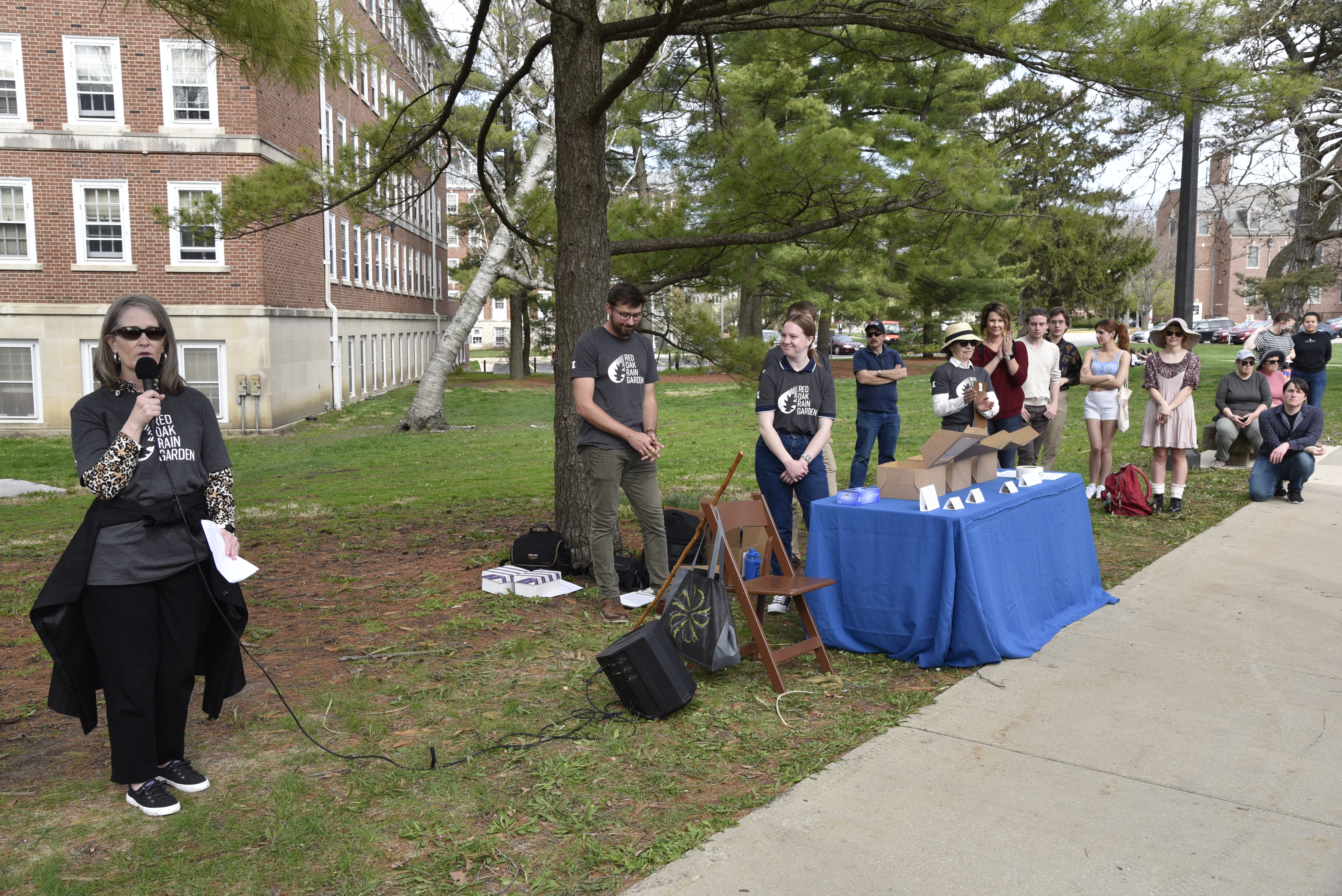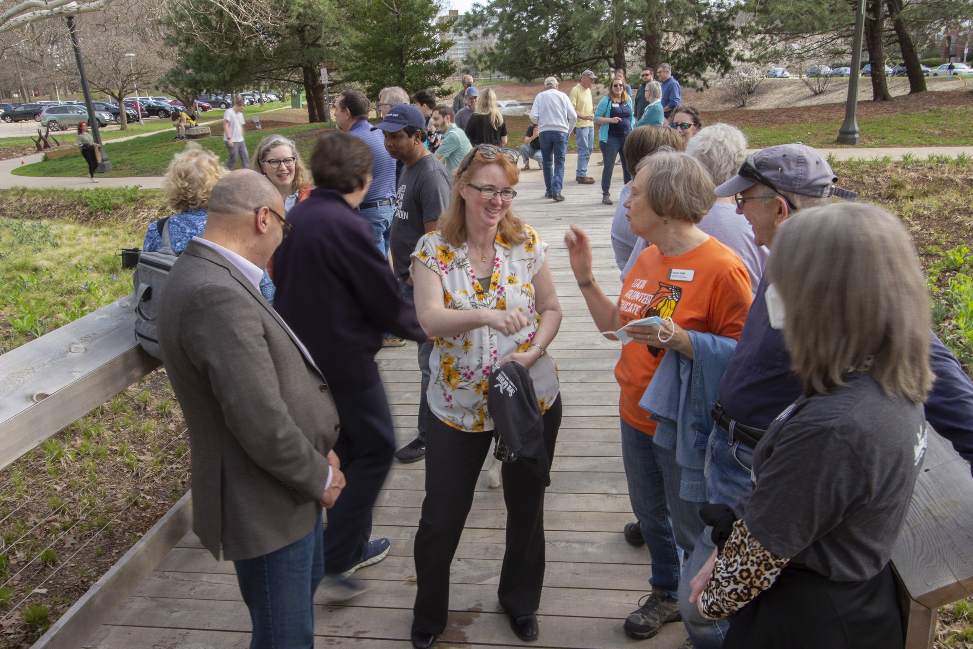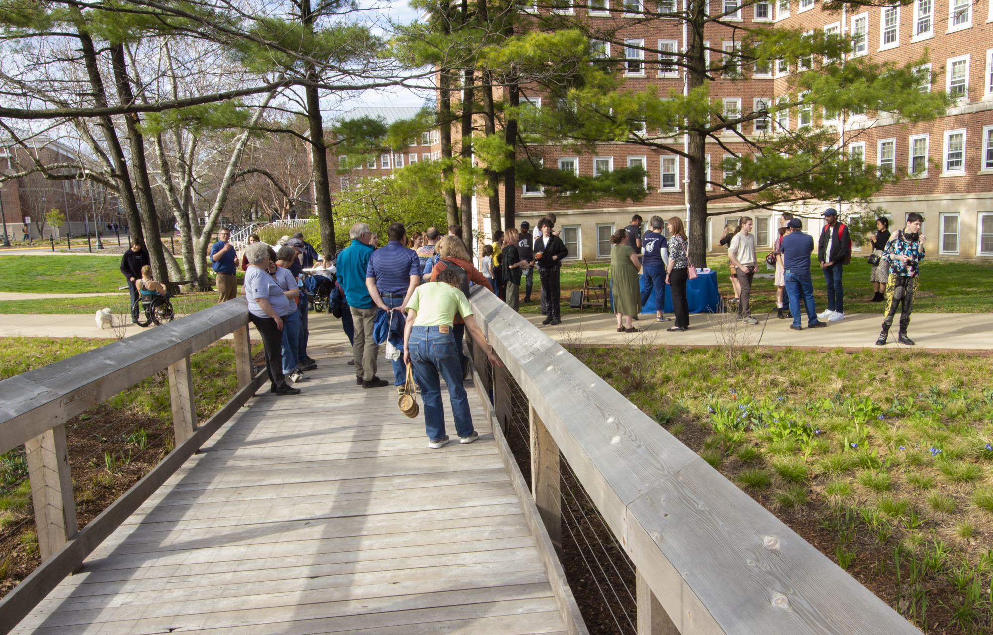 In late April, the RORG Team hosted a Garden Party to celebrate the completion of the boardwalk bridge that spans the rain garden. Remarks were made by Illinois Extension Director Shelly Nickols-Richardson and Shibu Kar, Illinois Extension Assistant Dean & NREE Program Leader and Illinois-Indiana Sea Grant Associate Director. Eliana made additional remarks highlighting Structural Engineer Bill Gamble, Construction Manager Shannon Tucker, and Allerton Park, who gifted the bridge’s sustainably sourced lumber. Then, she was joined by Layne to give a guided rain garden tour. At the event, the crowd was treated to acorn- and squirrel-shaped cookies from local bakery Berries & Flour.