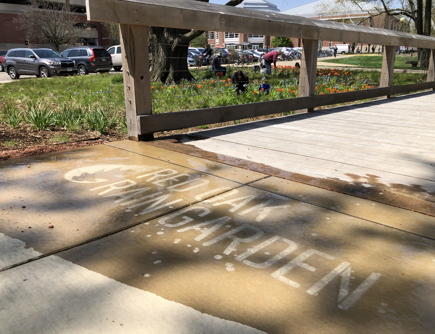 Exciting additions to the rain garden in 2022 include the installation of RORG’s logo near the entrance of the garden near Dorner Drive and on the bridge landings. You can only see the latter when it’s wet! Thanks to Rainworks, an environmentally-friendly hydrophobic spray, the RORG logo appears every time it rains — turning rainy days into a reason to smile. 🙂