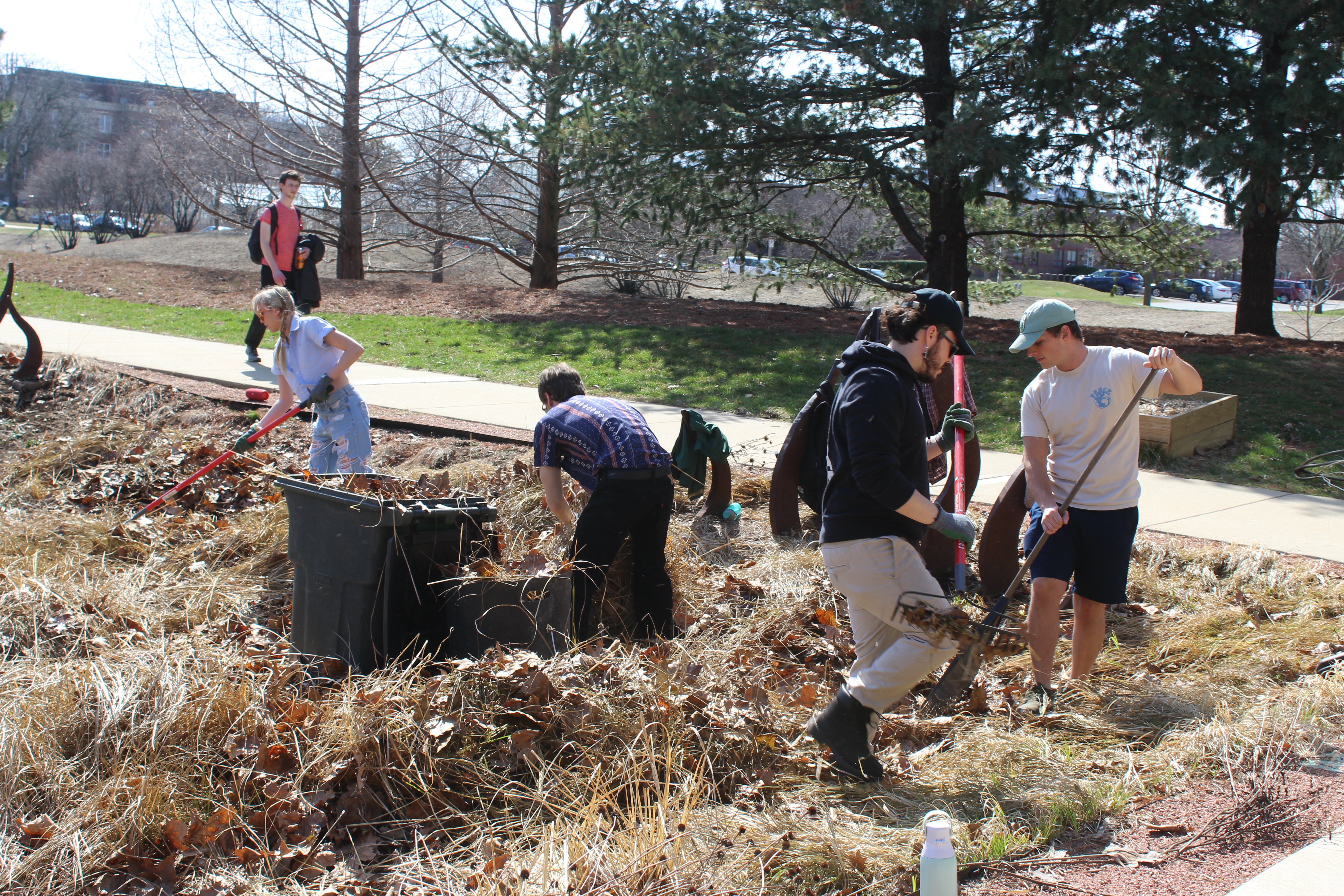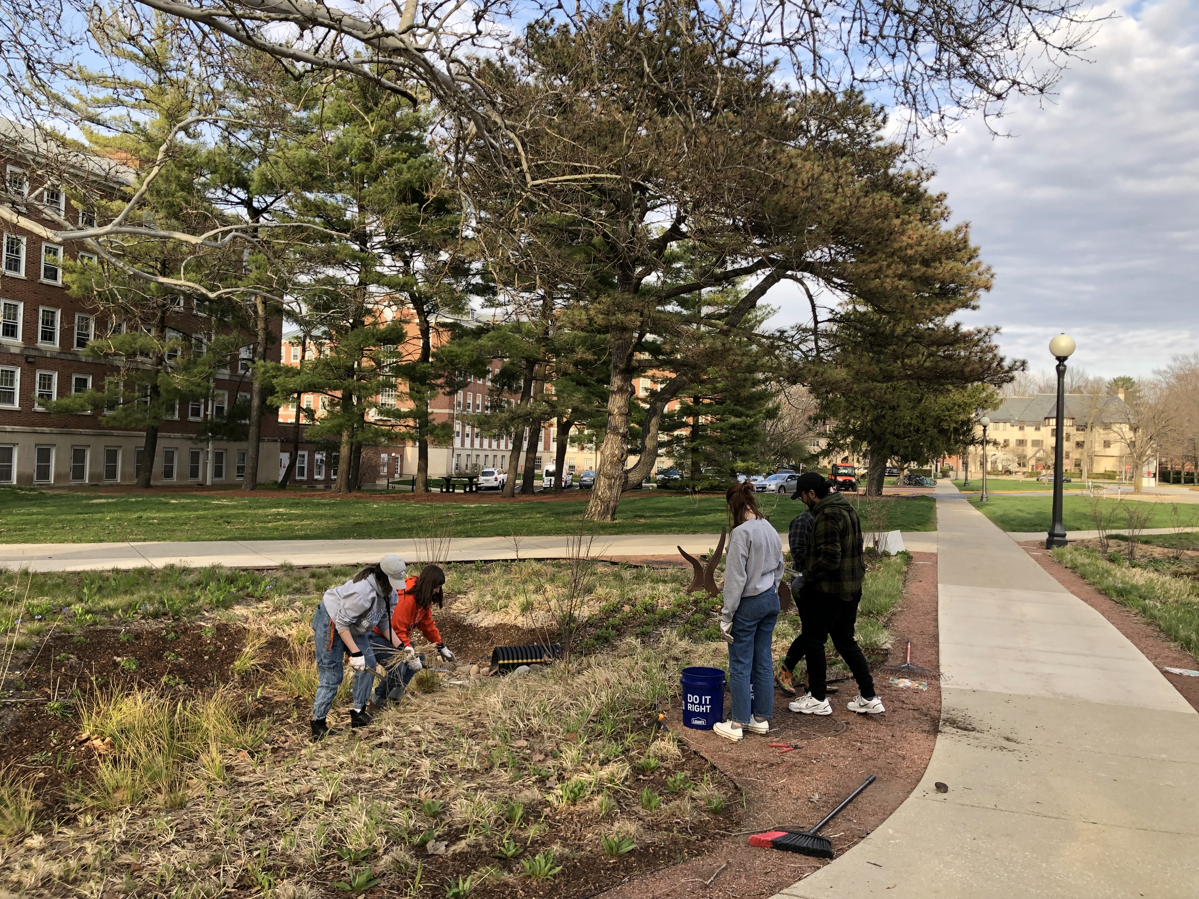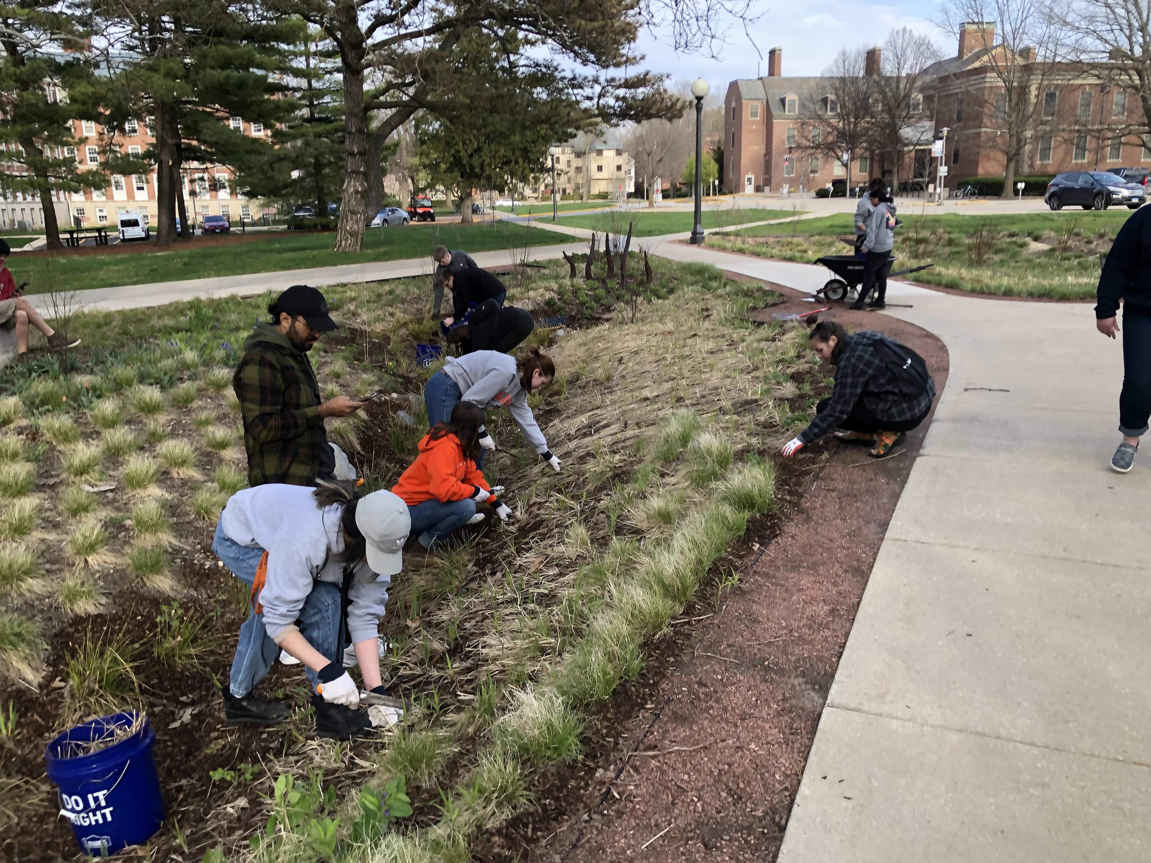 By late March, it was time to get into the rain garden to prepare for the growing season. We were happy to host Bridgette Moen’s Landscape Architecture Studio class, who worked alongside RORG Team members and Champaign County Master Gardener and East Central Illinois Master Naturalist volunteers. This annual event is a collaboration with Facilities & Services, who support our efforts by providing staff to help transport debris from the rain garden.