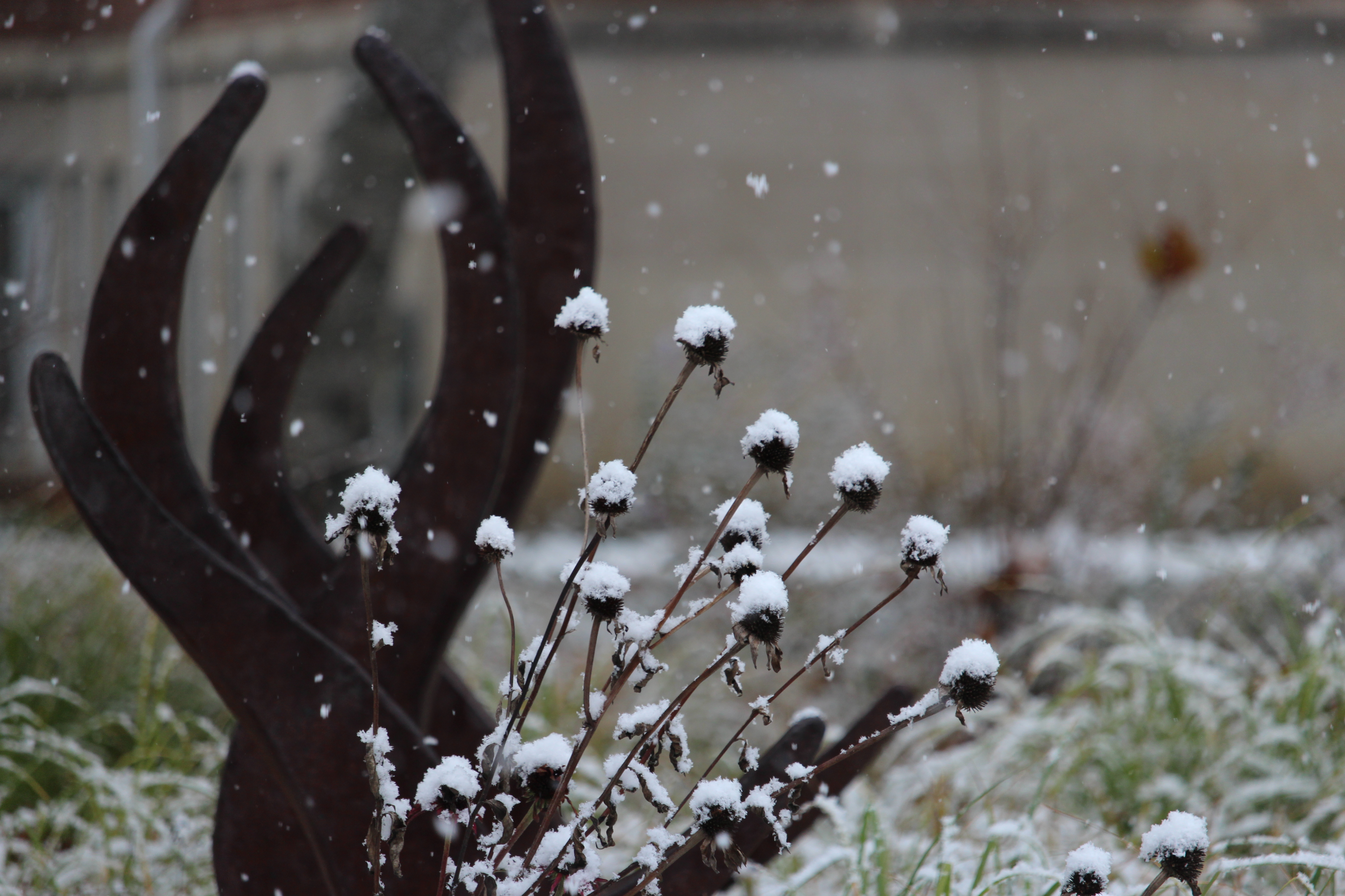 And now we return to winter, beginning with a beautiful mid-November snow. We all know there’s something magical about the season’s first snowfall. At RORG, it transforms the garden into a lesson about plant structure, color, and texture in a different way than seen in high summer. Winter snow tops the seedheads of many of RORG’s plants, notably Orange Coneflower and Purple Coneflower, punctuating each stem. Red Chokeberry’s scarlet pops against the snow drawing our eye, while the sedges and grasses’ frosty blades are surprisingly charming. Of note this year is a newcomer to the stunning winter-interest species list: ‘Hummelo’ Betony found at RORG’s Expansion Garden. We encourage you to bundle up and go see for yourself!