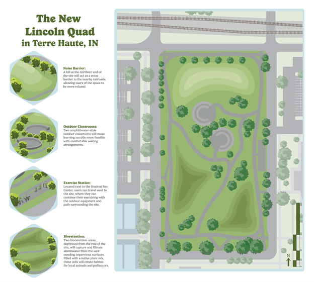 As a senior in Sustainable Design at Illinois, I spent my last semester as an undergrad focused on my Capstone project, which acted as a culmination of everything I have learned in my college education. I independently chose my problem topic, researched it, and designed a solution. With all of my passion and experience with the Red Oak Rain Garden, I wanted my project to emulate it to some degree. After many dedicated hours of researching and designing, I ended up with the New Lincoln Quad: an environmentally-friendly, relaxing green space dedicated to the student population of the Indiana State University (ISU) campus in Terre Haute, IN.