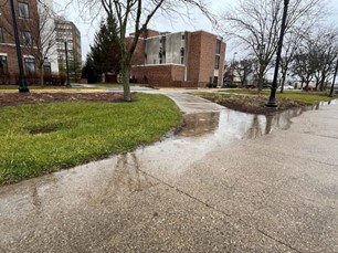 I deliberated for a long time on a suitable location for my project. I knew of a number of urban sites that had flooding issues, like my hometown neighborhood in Rockford, Illinois, or on our University of Illinois campus. However, I found that plans were already in place for the sites I had in mind! Given this, I widened my list of possible locations. As I discussed this issue with my partner and our friends, they made me aware of the stormwater issues on their college campus at Indiana State University (ISU). So, the next time I was in Terre Haute visiting them, we went on a tour of their campus, specifically the areas that they knew had flooding problems. That is where I found my site: a large empty plot of lawn, which I found out to be the site of a former dormitory (now demolished), called the Lincoln Quadrangle.