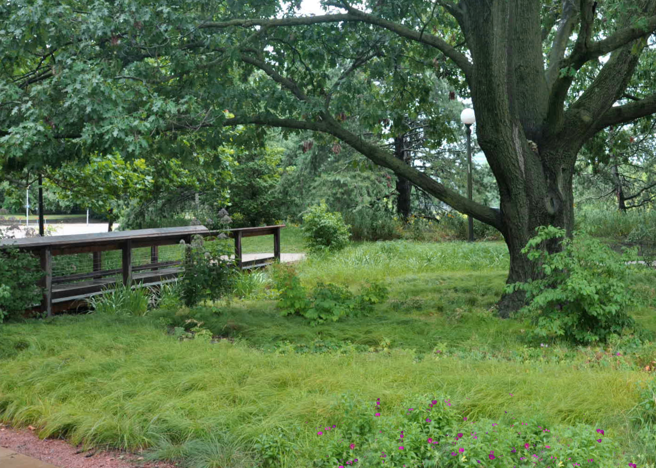 The Red Oak Rain Garden soaks up rainwater, enhances the campus and community aesthetic and educational experience, and promotes well-being for everyone who visits.